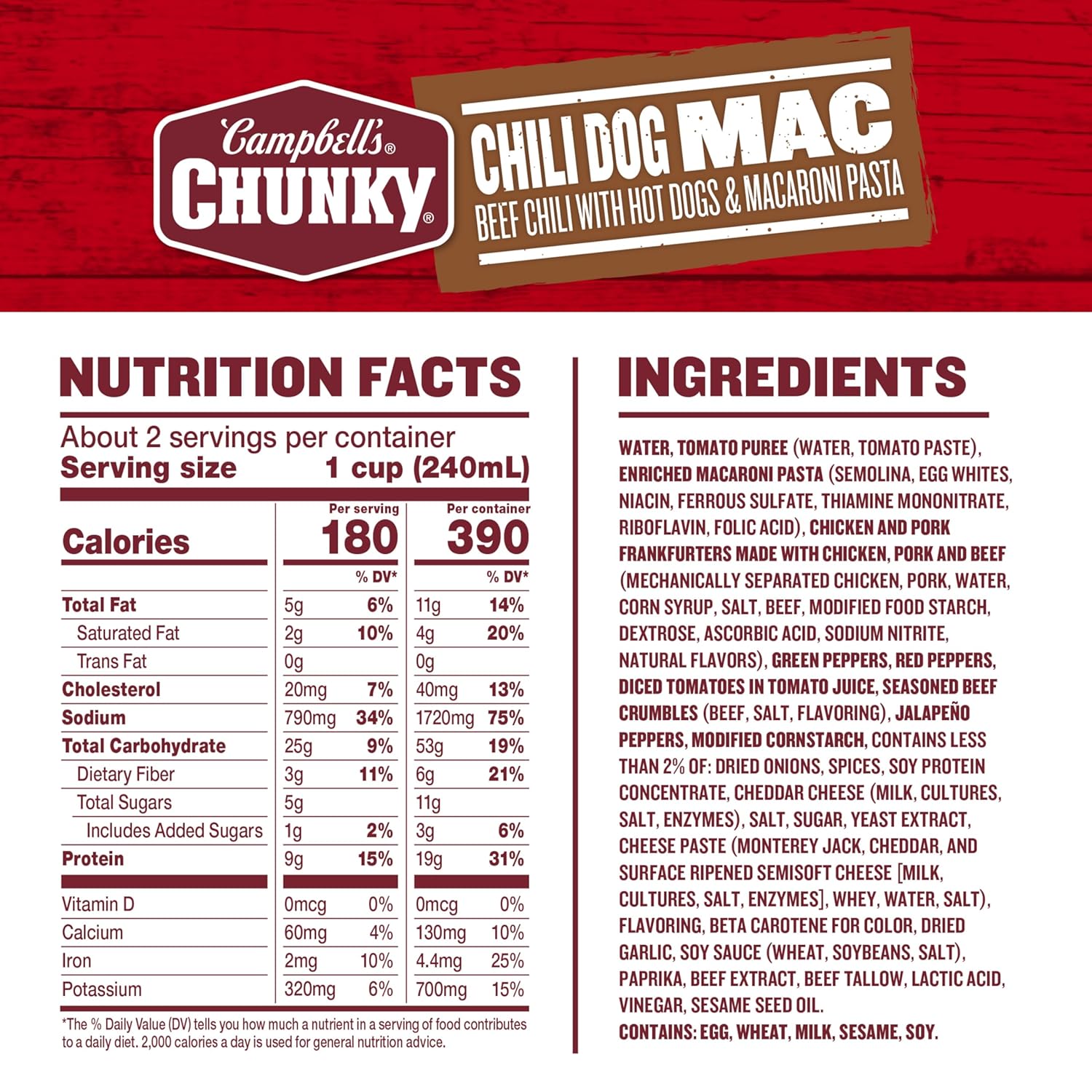 Tackle your hunger with Campbell’s Chunky Chili Dog Mac Soup. This canned chili mac soup features hot dogs, enriched macaroni pasta, red and green peppers, seasoned beef, and no beans for a comforting taste that’s just like mom used to make. With 19g of protein per can, it’s a satisfyingly chunky hot dog and beef chili mac that fuels even the heartiest of appetites. Campbell’s Chunky Soup is a year-round pantry staple and the MVP of game day snacks, delivering a winning combination of flavor and convenience. Enjoy a warm bowl of this canned soup when watching the game from home, or savor it at your next tailgating event. To prepare the microwave soup, simply pour into a microwave-safe bowl and heat — do not add water. Or heat in a saucepan on the stove, stirring occasionally. Whether you’re a football fan or simply craving something hearty, Campbell’s Chunky Chili Dog Mac Soup will keep you feeling full and satisfied from kickoff to the final whistle. Make every game day a winner with Campbell's Chunky – Soup That Eats Like a Meal.