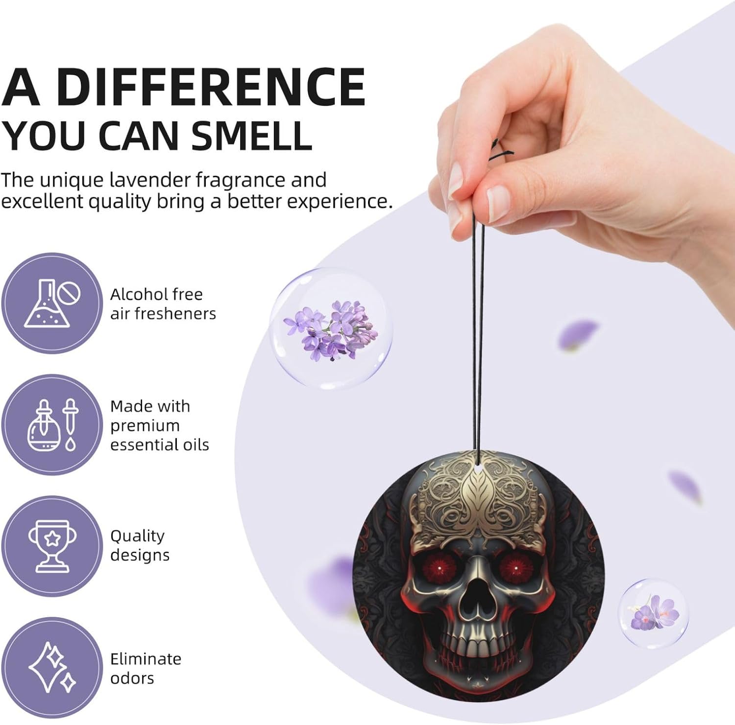 unobstructed vision: this Skeleton with Red Eyes rearview mirror scented fresheners doesn't obstruct your vision while driving, ensuring a safe and comfortable journey every time.easy hang: we've included a convenient rope for hanging, making it super easy to attach this christmas air freshener wherever you prefer. No fuss, no mess - just hang and enjoy the fragrance.incredible package deal: this rearview mirror pendant aromatherapy tablets package includes 6 pieces in 6 captivating designs and 1 refreshing scents (lavender). Experience a variety of delightful fragrances that will keep your surroundings smelling wonderful throughout the day.environmental protection: the car air fresheners for women smell can last for about 1-2 weeks. When the smell fades, you can add your favorite perfume. Continue to use, reusable6 pcs included: you will receive 5 individual shoe cabinet fresheners, each in its own package; enjoy consistent scents for nearly a year, or share them with your friends or families