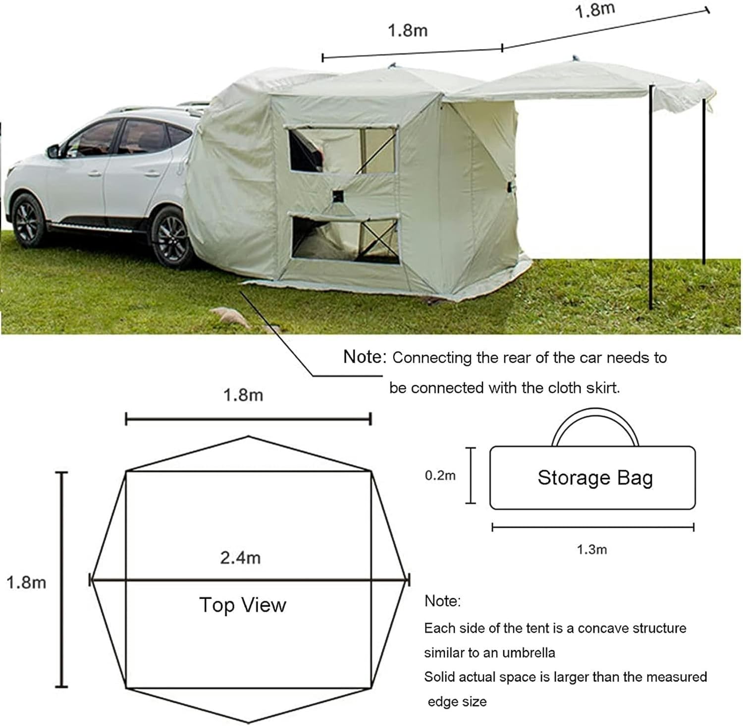 5-8 Person Water Resistant van awning Tent with Convertible Screen Room for Family CampingFeatures:Approx 13㎡ for two rooms.Automatic stand.Ventilated on five sides.Silver coated sun protection.Waterproof.Self-contained ambient light strip.Specifications:Name: instant pop up Teepee tents for campingNumber of people: 5 - 8 peopleMaterial: 210D polyester Oxford fabric coated with silverTent base material: Oxford fabricTent structure: double tentUnfolded size: 395X270X 183cmStorage size: 110X25 X 30cmWeight: approx. 22kg (with accessories and storage bag)Packing list:4 season tents for camping*1Ground Spike*6Drawstring*6Door Bar*4Backpack*1