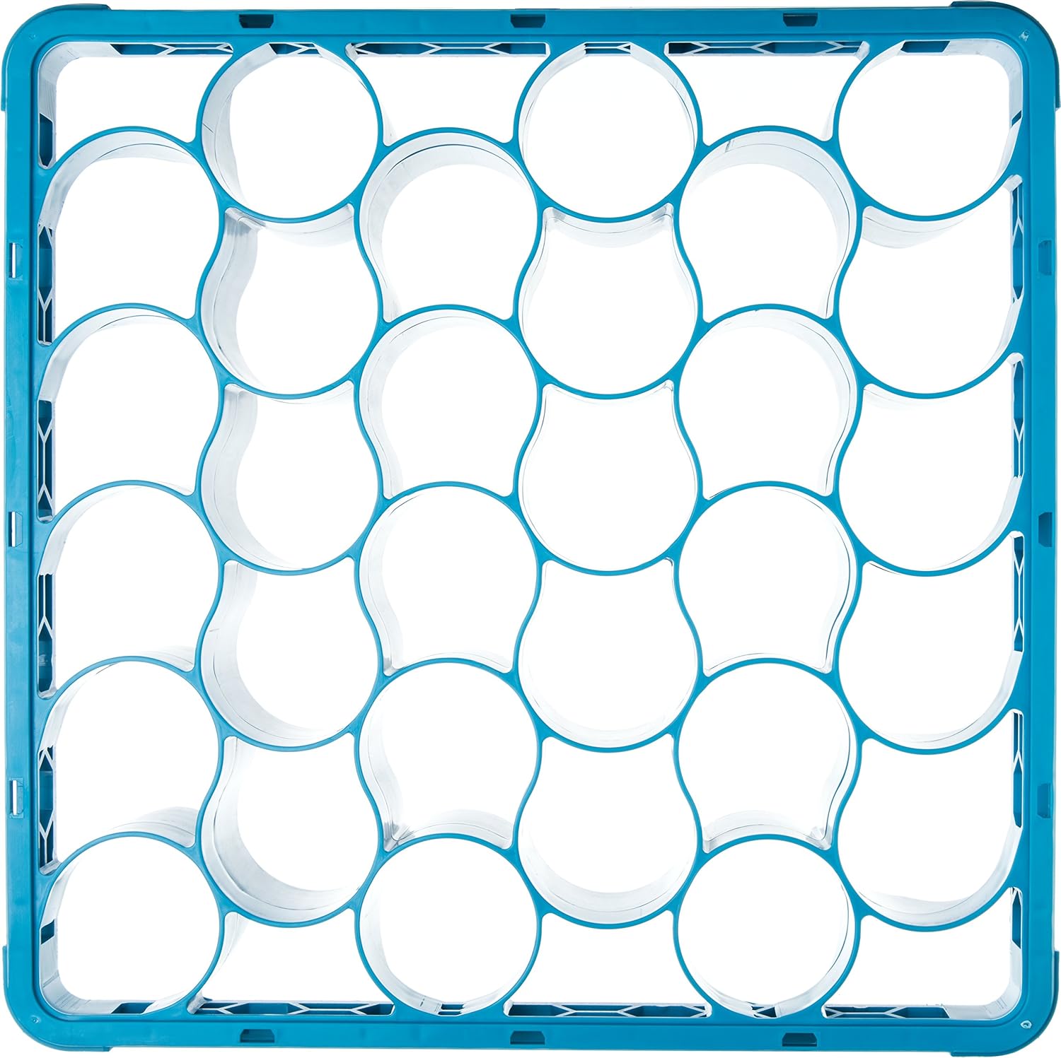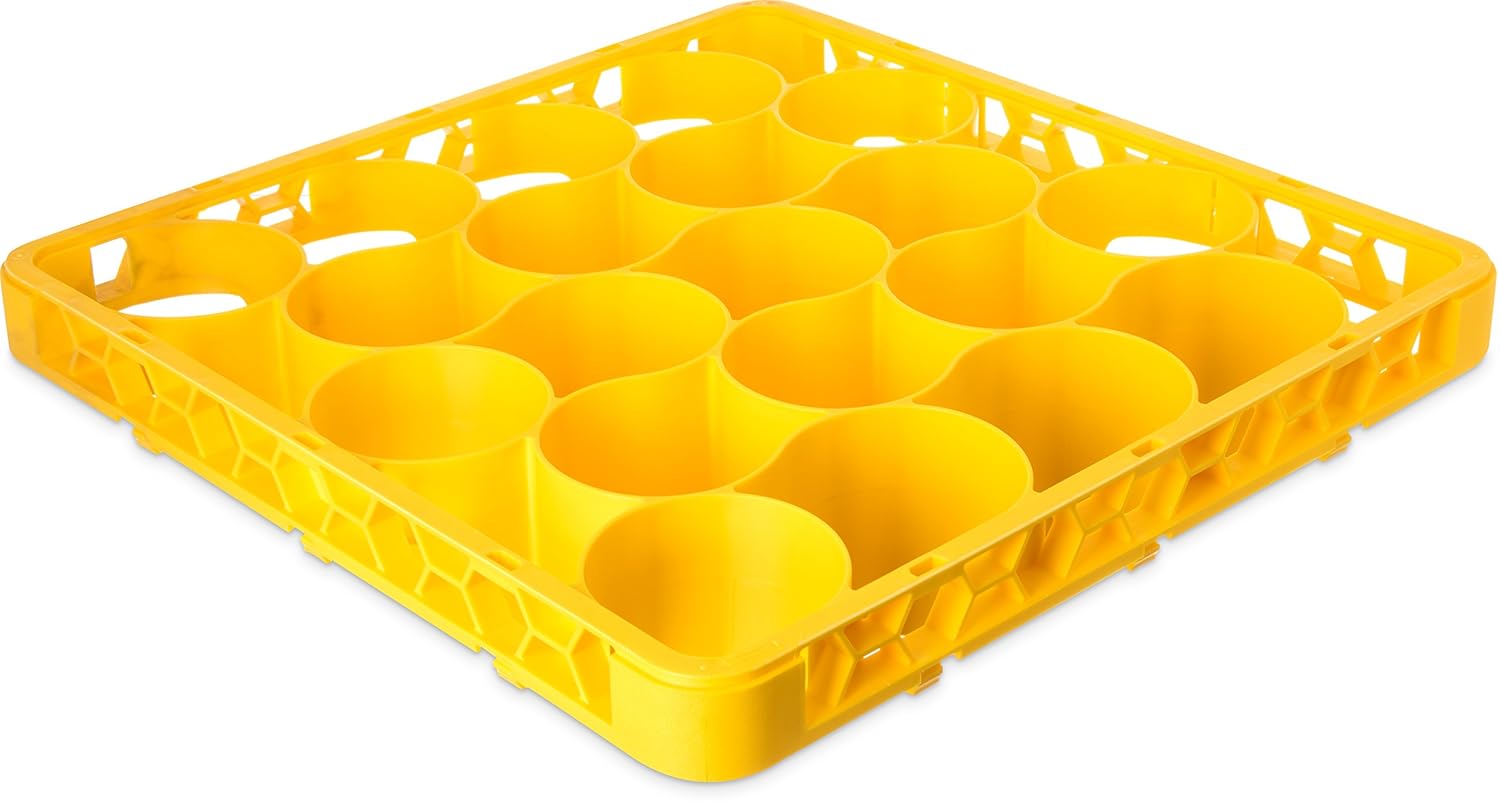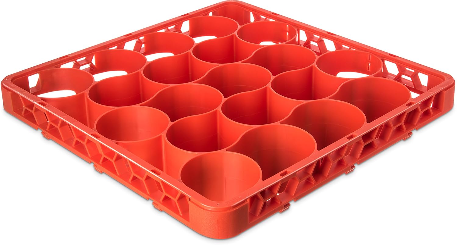 Carlisle Opticlean newave polypropylene 30-compartment long glass rack with 4 extenders. Holds 20 percent more glasses then comparable square compartmented glass racks. Reduces storage space, labor, needed rack inventory, and chemical usage by up to 20 percent. Rounded design holds glasses more securely in place resulting in less movement and breakage. Compartment sizes are designed to fit the most popular sizes of glasses and tumblers. Measures length 19-3/4-inches by width 19-3/4-inches. Dishwasher safe. Polypropylene material. Blue color. Made in USA.