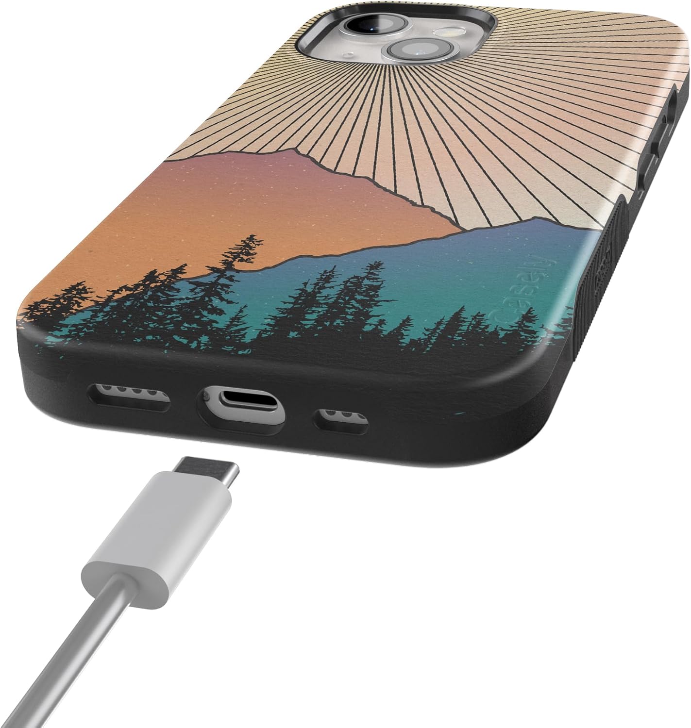 Rays of sunlight beam down over a mountain range, showcasing the silhouette of a stunning forest. It's all taking place at that hushed golden hour between night and day that's the inspiring vision you get to see every day when you pick up the Golden Hour Mountain Sunset case at Casely. It's easy to get lost in its beauty in the same way you might get lost in images of natural landscapes. If you're a hiker, camper, nature lover, or just appreciate beautiful horizons in general, this is the case for you. This case captures the natural world's magic but then subtly weaves in the robust protection of the technological one. With it, you get military-grade drop protection. It might be aesthetically pleasing, but this case is tough. And you'll need rugged protection when hiking up the mountains to see this vision in real life. With the Golden Hour Mountain Sunset in hand, you let the world know that you're an explorer with adventure in your sights, always ready to take in the bigger picture.