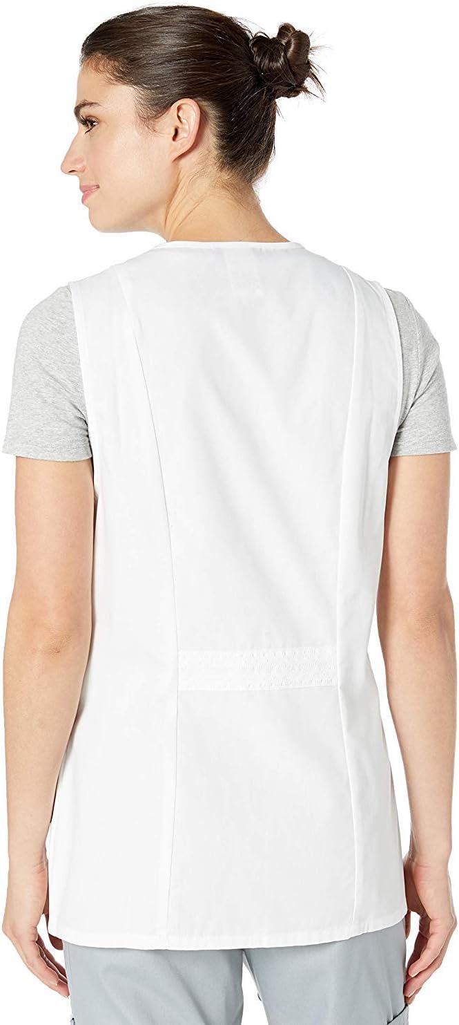 A Modern Classic fit top features feminine lace at the V-neckline, the top edge of the patch pockets and the center back belt of this button front vest. Princess seaming give soft shaping to the back. Center back length: 28".