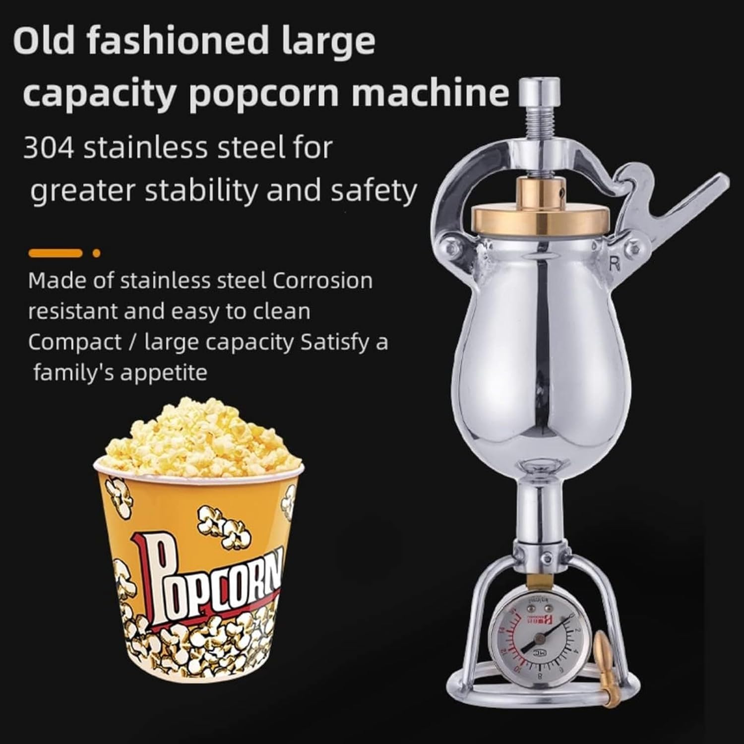 Please note the following when using️1. when adding corn kernels to the machine, only add half the contents of the container, do not add too much or too little.️2. tighten the top screw️3. take the wrench and tighten it further️4. when the pressure reaches 0.9 pressure, the corn can be removed from the oven. When the corn is removed from the oven, the bottom should be placed in the bag. Do not point it directly at people to avoid unnecessary damage.To ensure optimal results, avoid exceeding 15 minutes of preheating time when using a cold pan. Should you notice any burning smells or suspect leakage during operation, immediately open the pot to prevent overheating. Remember to fill the container halfway, and always be mindful of high temperatures and pressures.Specification:Product Name: Stainless Steel Popcorn MakerMaterial: 304 stainless steel integrated castingOperation mode: hand HeatingColor:SilverWeight: 2kg8 capacity optionsPackage:1 x Mini Popcorn Machine SetWarm tips:This product is retro mini popcorn machine popcorn poppers for home, and it has the function of popcorn. It is not recommended to pop it. If you need to burn a pot and play it, you must follow the instruction video