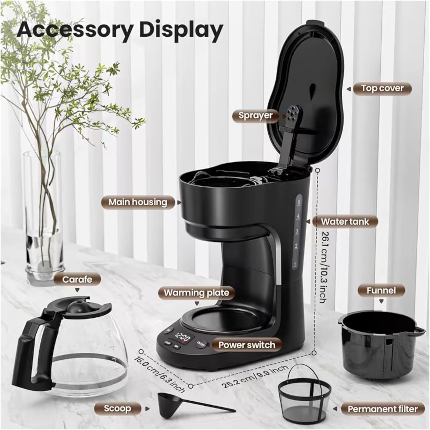 Transform your morning coffee ritual with this sophisticated drip coffee maker featuring a comprehensive accessory display. The sleek black design includes essential components like a permanent filter, convenient measuring scoop, and a glass carafe. The intelligent warming plate keeps your coffee at the perfect temperature for up to 2 hours with an auto power-off function for safety. The clear water tank with level indicators ensures precise brewing, while the sprayer system provides optimal water distribution over your grounds. The user-friendly control panel includes a power switch and timer display for easy operation. With its compact footprint measuring approximately 6.3 inches wide and 9.8 inches deep, this coffee maker efficiently uses counter space while delivering delicious coffee. The included funnel and permanent filter eliminate the need for paper filters, making this both practical and economical for daily use.
