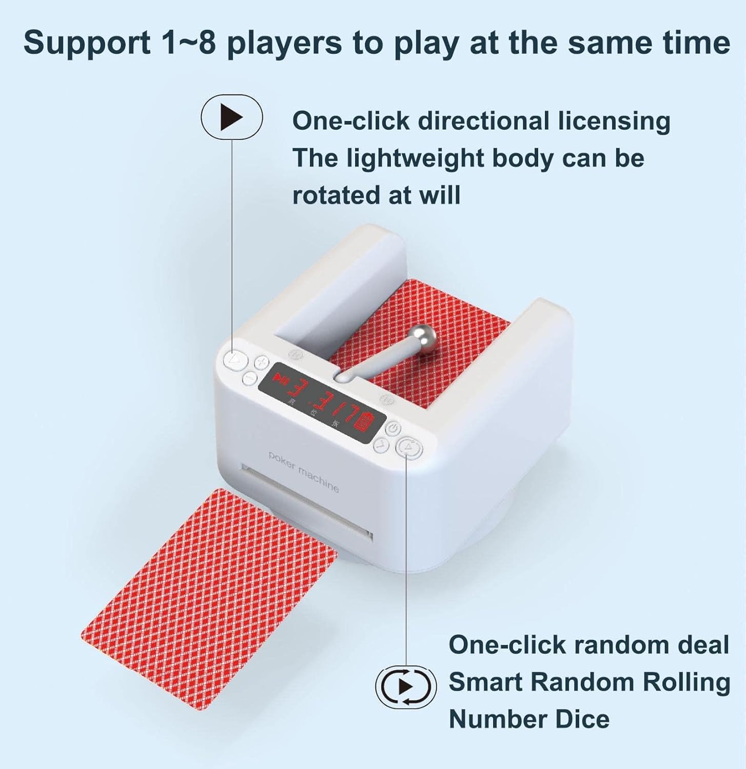Product DescriptionKeep your hands free when playing poker with family and friendsProduct parametersName: Smart Poker DealerApplicable playing card size: 87 x 57 / 88 x 63 / 96 x 60mmMaterial: ABS/POMProduct Weight: 1.4lbs/650gProduct size: 12 x 12.5 x 8.5cmMaximum number of players: 8The maximum number of cards dealt: 792 cardsProduct packaging1 x Card Dealer (Without Batteries)1 x tableclothThe card dealer deals card games such as bridge and poker, Texas hold'em and UNO game cards. Incredible for all ages, shuffle decks to speed up game time and focus on the game instead of fiddling.