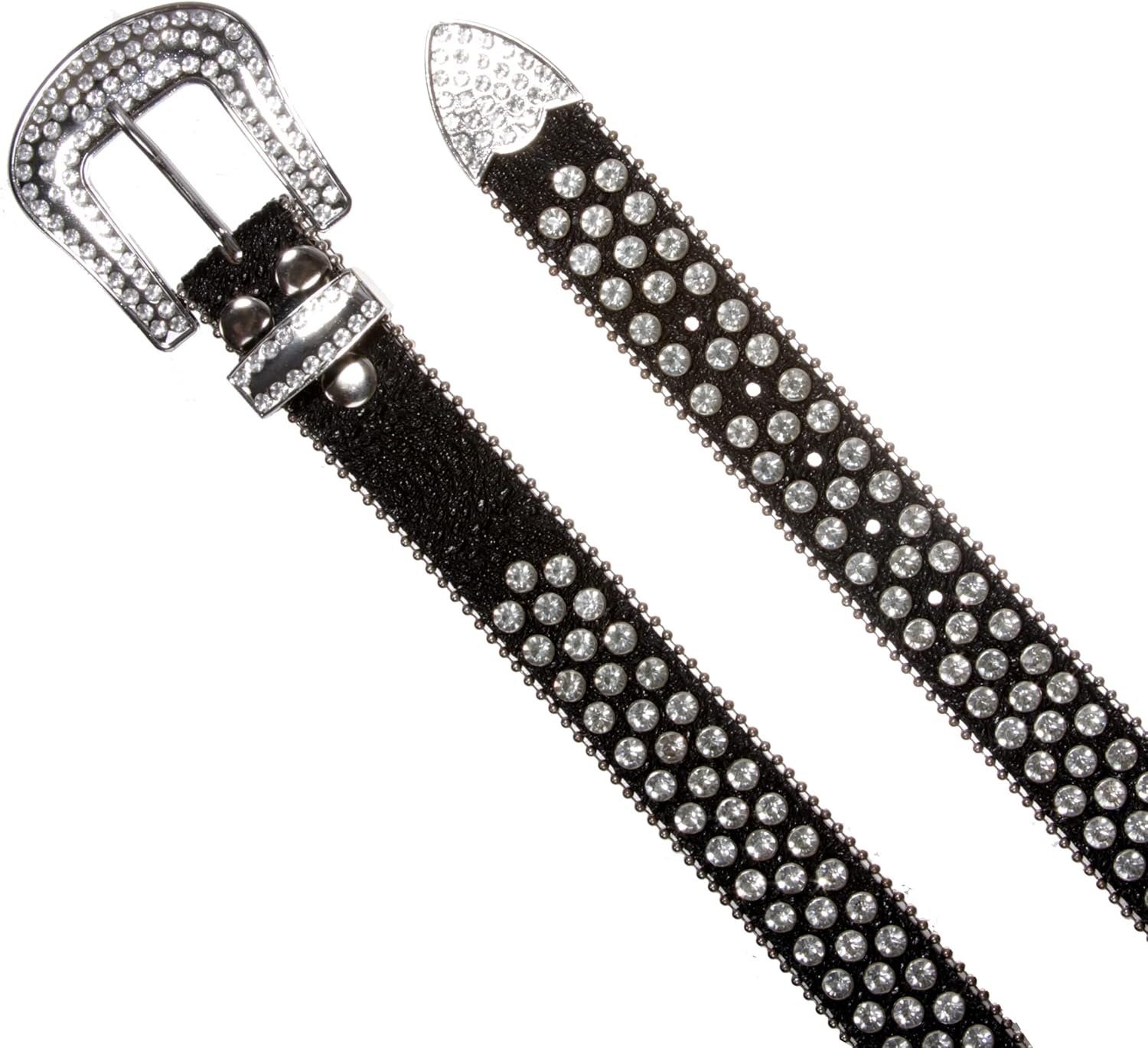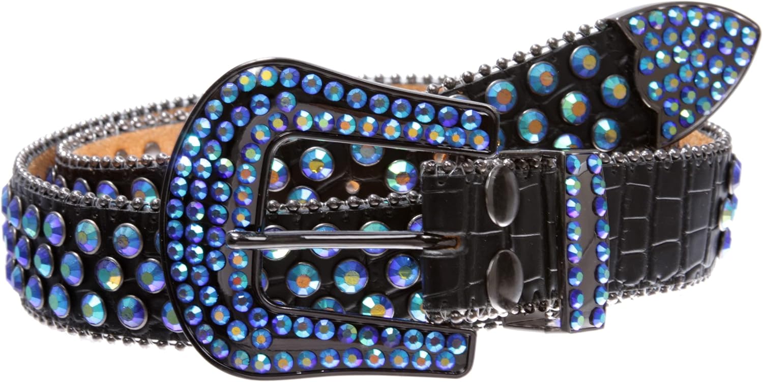 Material: genuine leather lining with quality faux leather with metal ball chain edgesWidth: 1 1/2" - 38 mm Sizing: the size option indicates the measurement from buckle to the middle hole, excluding buckle. Belt strap is 1 1/2" (38mm) in width, buckle dimension: 3.75" X 3.5"Sizing: belt size is measured from buckle prong to center hole, the third hole from the tip end, excluding buckle length. Order one or two inches larger than pants size for best fit, e.g. 32"-34" pants take belt size S/M-34"Snap on interchangeable buckle