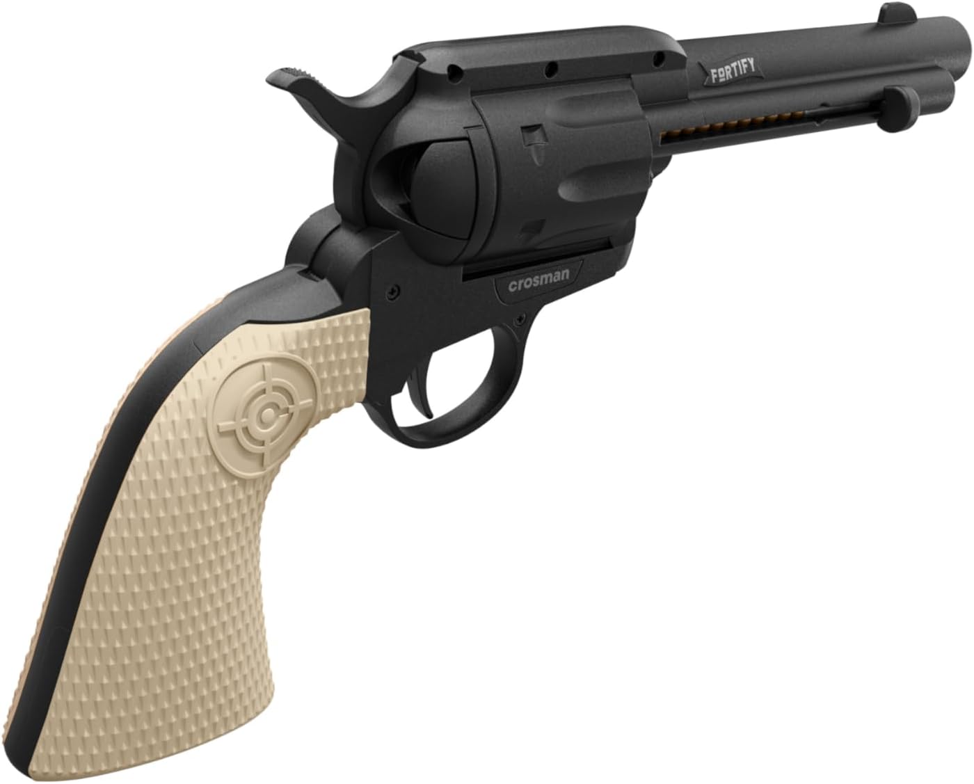 Those tin cans and spinning targets have been taunting you from the backyard. Take matters into your own hands with the new Fortify CO2-powered BB air pistol! The Fortify features a classic, western-style revolver look with black and white color. Compatible with 4.5mm steel BBs (not included), the BBs are spring-fed for easy loading and higher shot counts. The Fortify features a functional hammer, holds 18 rounds and slings BBs up to 420-fps. Airpower Adventures start with Crosman.