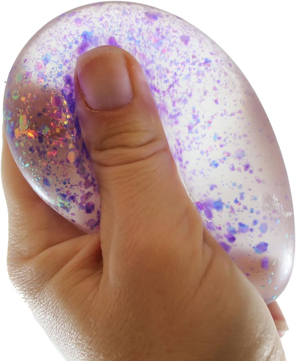 SET OF 1 RANDOM COLOR - This is a very fun stress toy that is not only calming, but it also helps build hand and finger muscles and bilateral coordination. It is beyond amazing and has a super soft dough feel. You can poke and pinch it and it will retain its shape, then slowly ooze back into a ball just like a slow rise squishy would. These are filled with light colored gel and shimmery glitter. What it feels like - super soft cookie or bread doh inside a ball. It is almost like a moving doh because when you release it slowly goes back to a ball shape. What is inside it - Very thick clear glue like filling - The filling is super sticky and stretchy. The ball is about 2.4" when it is round, but can be stretched out! This is very calming because it has a very silky soft feel, and you can pull and indent it multiple ways. I like it because you can turn it and pinch it just like you did in elementary school when you made pinch pots with clay. You need to feel it to really know how nice these are.