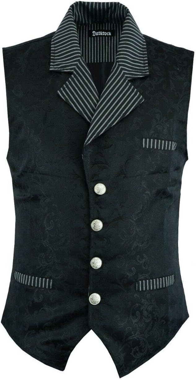 New Designer Rycroft black brocade gothic steampunk Punk Rock Waistcoat Vest,nice Sleeveless Vest ,with custom Victorian style woven ivy pattern. Unique 4 buttons Fabric: 50% Cotton 50% Polyester,great Victorian Style pattern.3 Front Pocket with black ivy pattern,,Has nice Cut from back,adjustable back straps. Great Quality Gothic Style Vest,Brocade fabric With 4 Snap Buttons,USA Design Small: Chest- 38". Medium: Chest- 40". Large: Chest- 42". X-Large: Chest- 44". 2XL: Chest- 46". 3XL: Chest 48" 4XL :Chest 50" 5XL:Chest 52" They are tailored slim & Fit style,How to Measure your Chest size Please use a Flat surface,put any garment on that flat surface,Measure armpit to armpit and then multiply this figure to times 2(meaning double that ),So if its measure 22" inches so its means 42" ,so that is makes your chest size Large,if you like more room in your Vest,Please order one size bigger. The size is normally US sizes So we recommend you to double check size measurement in each product description comparing with your clothes. If you haven't tried our goods before, we suggest you to pick 1 size bigger items.DR# 1033