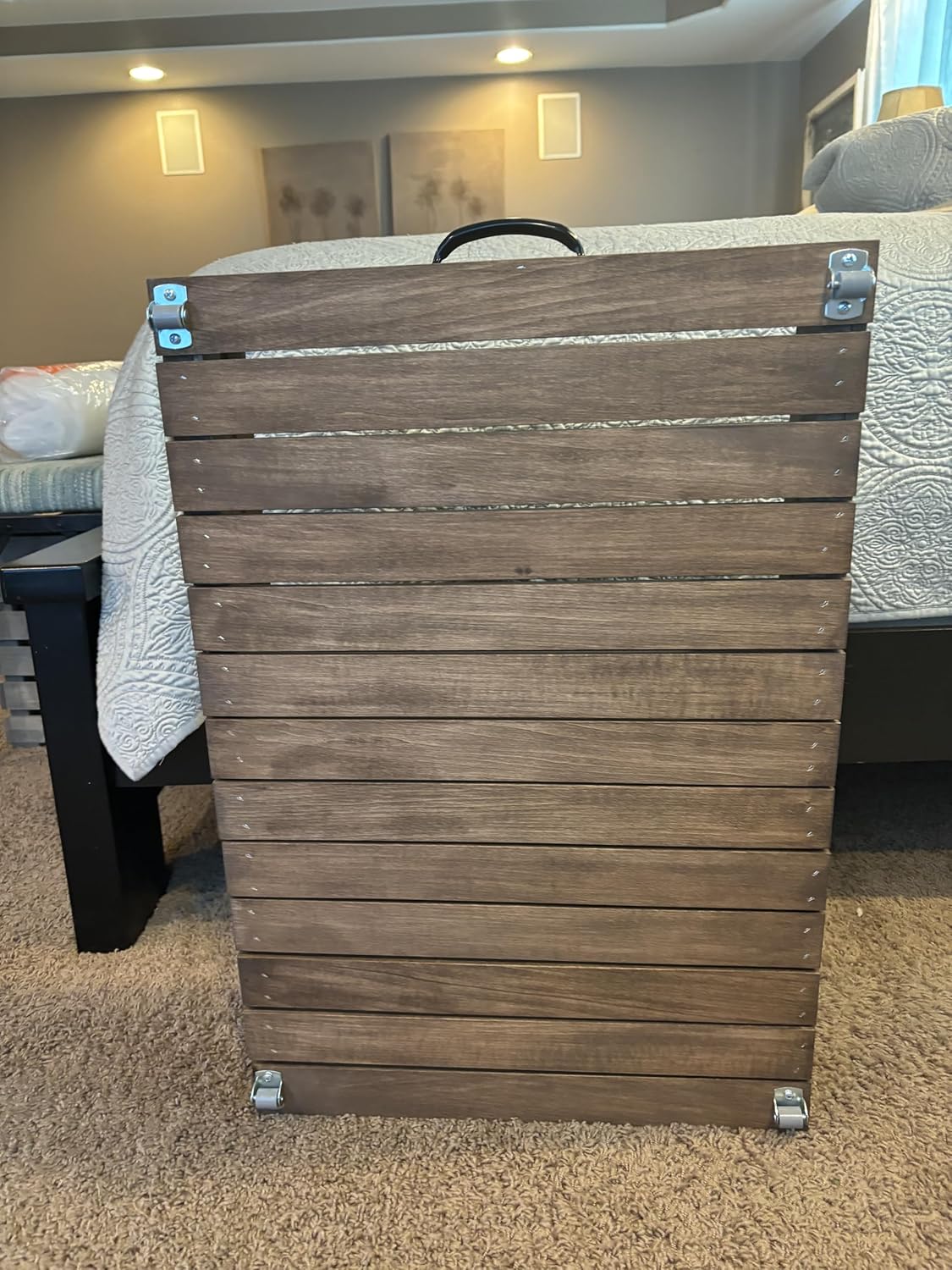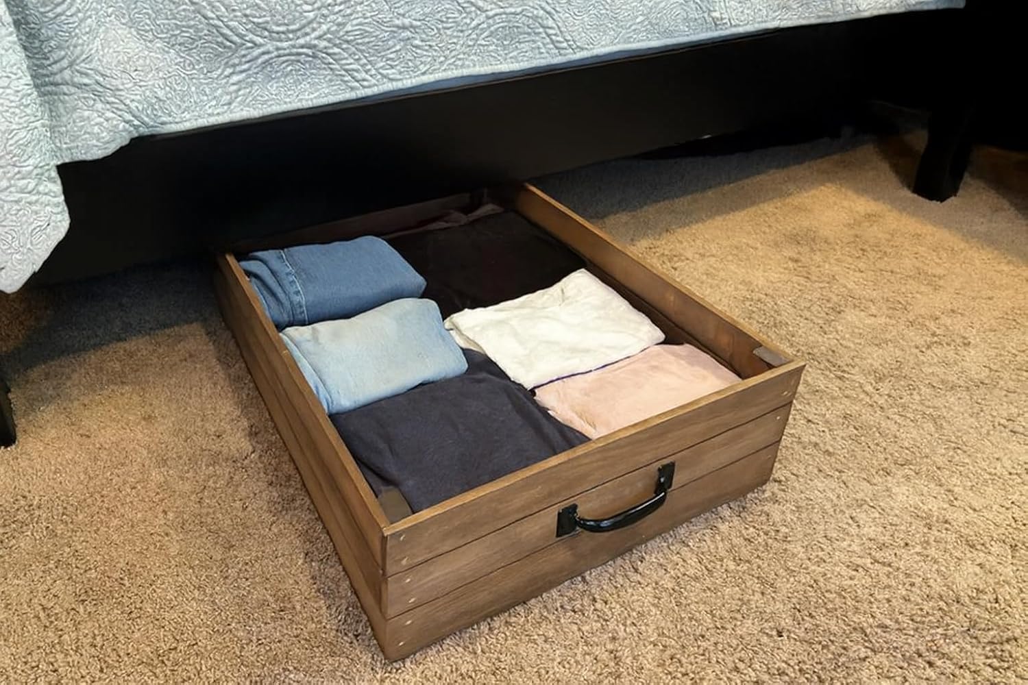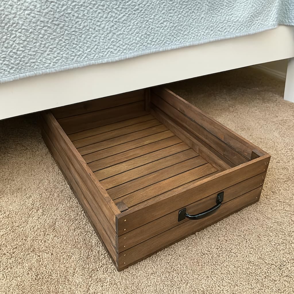 Add both charm and functionality to your bedroom or living space with this Rustic Wooden Under Bed Storage Crate. Measuring 19" wide x 27-3/4" long x 7-3/8" high, this generously sized crate is designed to fit neatly under most beds while providing accessible storage for household essentials. Crafted from durable basswood with a slatted design and warm rustic finish, this storage bin blends farmhouse-inspired style with everyday practicality. A sturdy black metal handle on the front makes it simple to pull the crate out when you need it and slide it back in when you’re done. Perfect for storing blankets, linens, clothes, shoes, toys, or seasonal décor, this under bed organizer helps you make the most of your unused space while keeping items neat and easy to reach. Whether used in bedrooms, dorm rooms, or guest spaces, this wooden storage crate offers timeless design and reliable functionality.