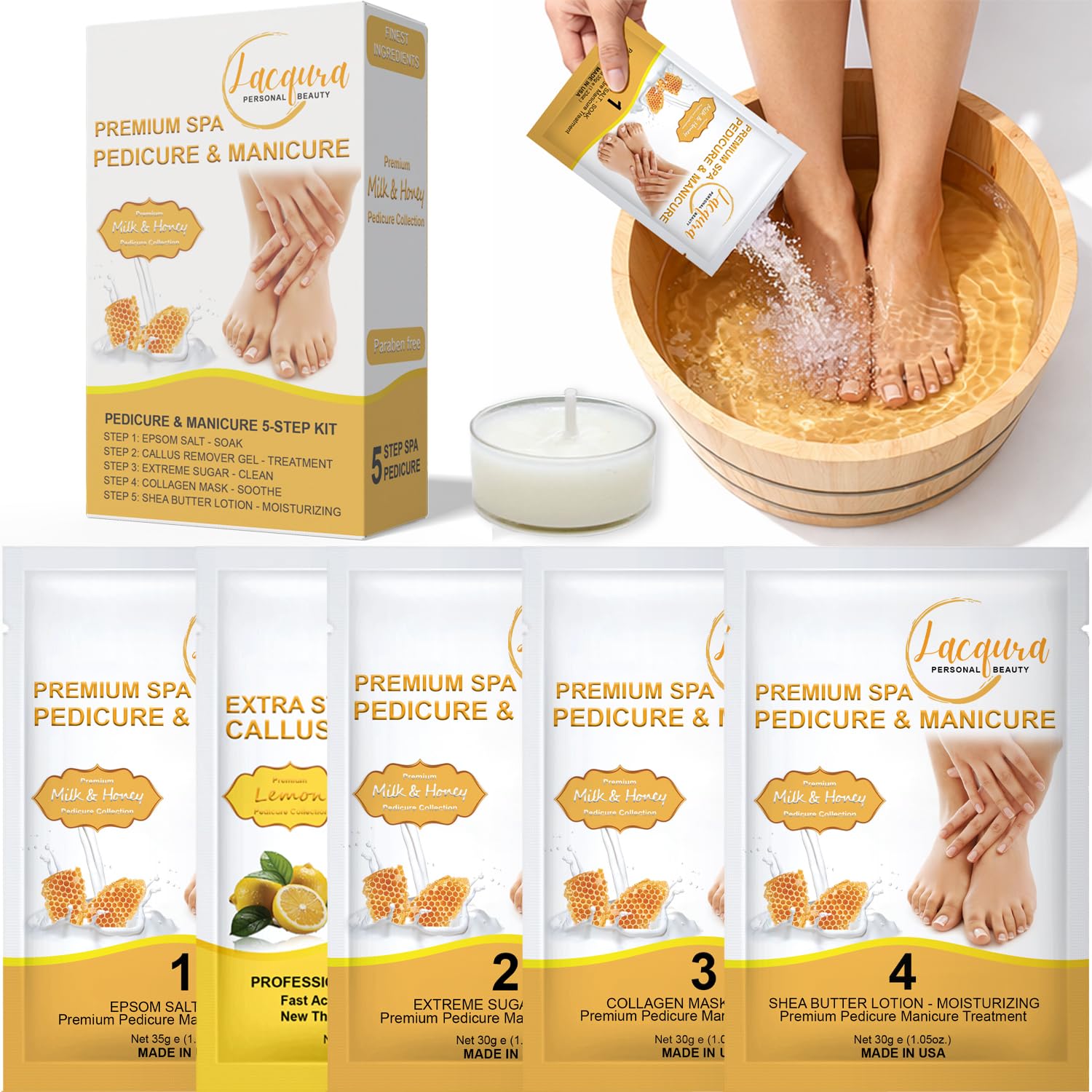 | Product Benefits | • All-in-One Convenience – Six essential pedicure steps neatly packaged in one box for easy use at home, in salons, or as a thoughtful self-care gift., • Deep Hydration & Skin Repair – Collagen mask and shea butter lotion deeply moisturize, soothe dryness, and help restore soft, healthy-looking skin., • Professional Spa Results at Home – Delivers a complete 6-step pedicure treatment that mirrors salon-quality care, saving time and money while achieving smooth, refreshed feet., • Relaxation & Stress Relief – Massage oil candle melts into warm nourishing oil, enhancing relaxation and creating a calming spa atmosphere during every pedicure., • Softens Calluses & Rough Skin – The soak, callus remover gel, and exfoliating sugar scrub work together to break down tough, dry skin and improve overall foot texture. |