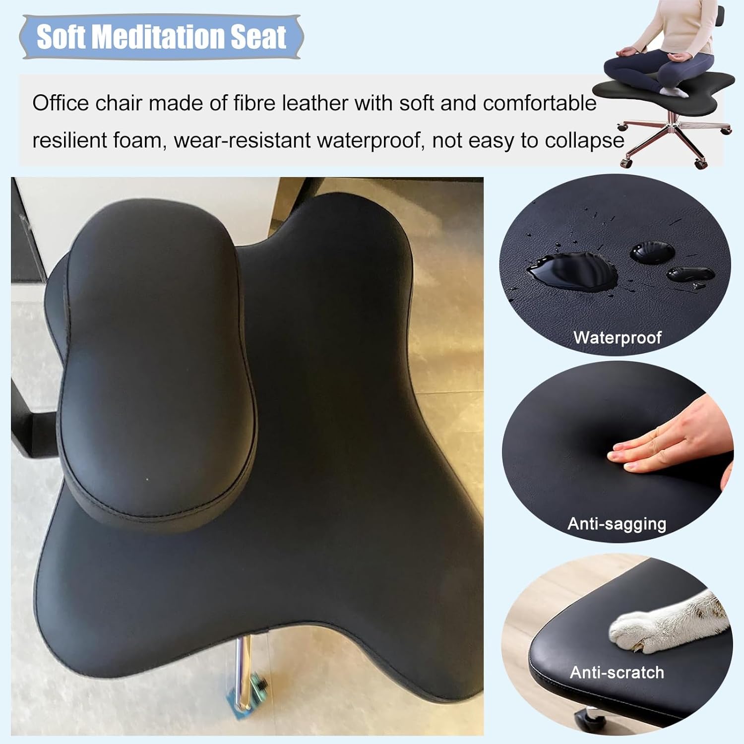 Tired of sitting in a fixed positionLegs crammed into a traditional office chair are depressingThe ergonomic cross-legged chair gets rid of the stiff sitting posture of office chair. You can enjoy a variety of comfortable postures such as cross-legged, squatting, kneeling and so on.Specification:- Assembled or not: yes- Material: Leather, Foam, metals- Load Capacity: 150kg(330lbs)- Seat Height: 53-62cm(21-24in)- Suitable for Tables High: 70-120cm(27-47in)- Suitable for Stature Height: 155-185 cm(61-72in)Features- Suitable for people of different heights.- Ergonomic design improves sitting posture.- Double-deck design with adjustable height.- Ideal for home, office, school and many other settings.- Strong and , can easily support 150 kg/300 lbs.- Includes swivel wheels at the bottom for easy mobility.- Soft leather is easy to maintain, just wipe with a damp cloth.- Great for fidgeters and helps to improve concentration and creativity.- Different sitting postures, such as cross-legged, kneeling, squatting, etc.Q: What is the maximum weight capacity of the productA: Recommended for weights up to 350 lbs.Q: How to adjust the height of the kneeling chairA: Pull up the pneumatic rod, the seat can be adjusted in 21-24in.Q: How thick is the seat and is it memory foamA: The seat cushion is made of 3 inches of memory foam.Note: - You will use different muscles in a kneeling chair, so it's best to acclimate yourself when first using or switch positions throughout the day.