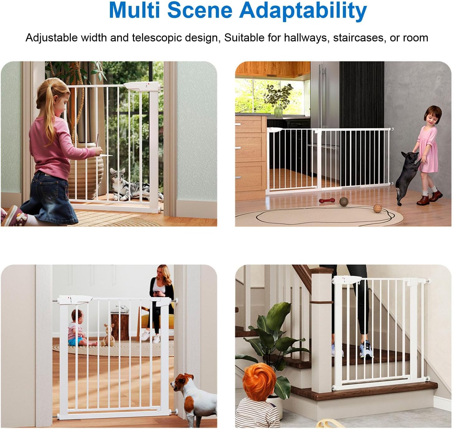 1. Easy Installation: Featuring a secure pressure telescopic structure, the pet gate requires no drilling or tools. It securely fits onto door frames, hallways, or stairways by rotating the knob or applying pressure, protecting wall integrity, easy to install and remove without leaving marks. 2. High Strength Safety Design: Crafted from thick metal tubing, the dog gate boasts a robust structure that prevents dogs from pushing through and cats from slipping out. The scientifically designed mesh spacing prevents small pets from getting their heads stuck or pinching their paws. 3. Lockable Door: The pet gate includes a lock function in the middle, allowing adults to easily push or pull through with one hand, preventing pets from following outside or accidentally entering danger zones like kitchens, staircases, or balconies. 4. Multi Scene Adaptability: With its adjustable width and telescopic design, the pet gate is suitable for various scenarios such as hallways, staircases, or room partitions. It supports multiple configurations, allowing expansion into larger enclosures for added versatility. 5. Sleek and Easy to Clean: The pet gate features a simple, modern appearance and neutral color that blends seamlessly into home decor. Its smooth surface allows for easy cleaning with a damp cloth, ensuring durability without deformation over time. Specification: Item Type: Pet Gate Material: Iron Applicable Width: Approx. 75 - 82cm / 29.5 - 32.3in Package List: 1 x Pet Gate 1 x Accessory Box (Accessories x 26) 1 x Instruction Manual