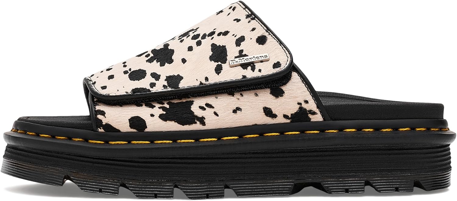 The Dr. Martens Zebzag Slide gets a playful remix in cream-and-black Dalmatian print Hair-On leather. A riptape closure keeps things snug, while the hybrid air-cushioned sole—part featherlight EVA, part rugged PVC, makes every step feel easy. Finished with a black-and-smoke sole and yellow stitching.