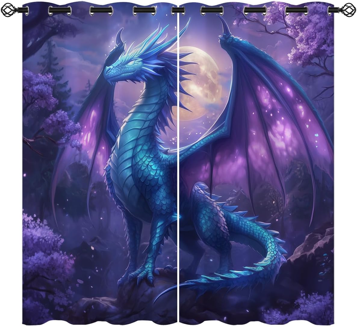 These print curtains are perfect for Living room, bedroom, kids room, kitchen, yard, patio, parlor, sliding door with Dragon, Dream Mythical Western Magic Galaxy Mountain pattern.- Unique design:· Save energy costs by insulating against heat and cold.· Reduce noises from busy streets and high-traffic areas.· Protect furniture from sun damage and fading.· Provides complete privacy when needed· Perfect for any bedroom, office kids room and living room.- Package Included:· Blackout window curtains 2 Pcs set ( two panels).- Material:· Our Blackout Curtain Liners are crafted from a long lasting soft and thick triple weaved blackout fabric which can block out sunlight and UV rays. The darker color of the fabric, the more light it can block.- Easy Care Instructions:· Machine washable in cold water· Do not bleach.· tumble dry on low· low temperature ironing- Notes:· For your curtains to be more perfect, please choose a size 5-10 Inch larger than the actual window width.· here may be slight differences in colors on different displays. If you have any questions about the product, please feel free to contact us.