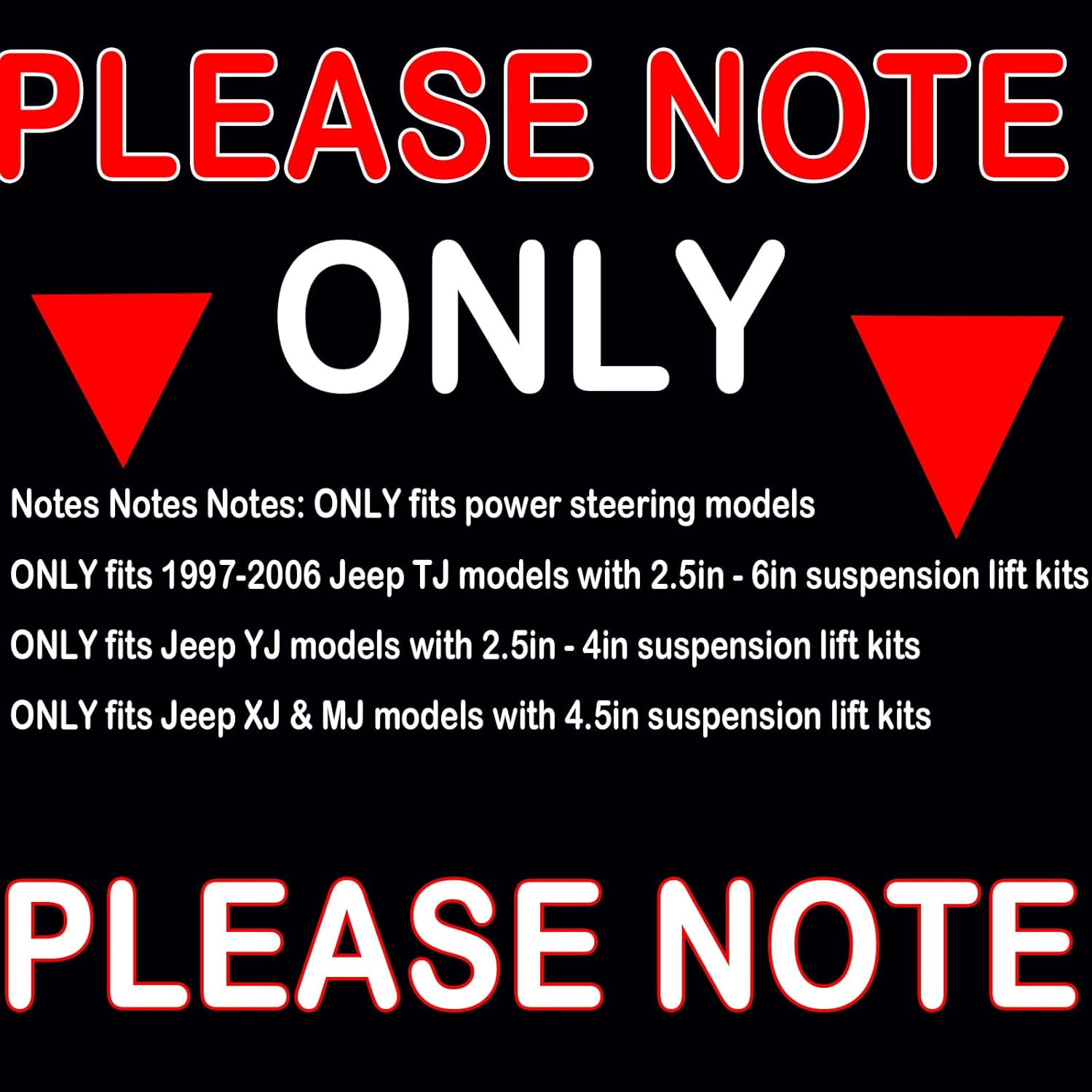 Notes: ONLY fits power steering models. ONLY fits Jeep TJ models with 2.5in - 6in suspension lift kits. ONLY fits Jeep YJ models with 2.5in - 4in suspension lift kits. ONLY fits Jeep XJ & MJ models with 4.5in suspension lift kits Fitments: 1985-2001:2WD:Jeep:Cherokee. 1984-2001:4WD:Jeep:Cherokee. 1986-1992:4WD:Jeep:Comanche. 1986-1992:2WD:Jeep:Comanche. 1987-2006:4WD:Jeep:Wrangler.