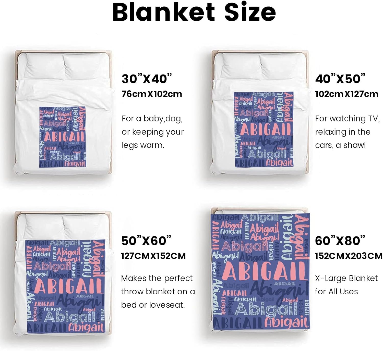 Features: 1.Design your own special fluffy plush ultra-soft micro flannel throw blankets with name or text you want. 2. Made of high quality anti-pilling flannel, which is soft touch, pilling resistance, wrinkle resistance, durable and comfortable, have a good touch and friendly to your skin, your kids, your family. 3. Suitable for all seasons, perfect for bed, sofa, camping, cold movie theater or traveling. 4. Easy to Care: Machine washable or hand washable, tumble dry at low temperature, holds several machine wash and dry beautifully. 5. No matter what name you provide, we will print them well on your personalized blanket, which will be the most unique gifts or souvenirs on various holiday, anniversaries. 6.Perfect gifts for Birthday, Christmas, Wedding, Anniversary Valentine's Day. How to Customize: This product is designed with the tools that you can create a very exclusive gift. 1.Choose the size and color you want 2. Click "Customize Now" button 3.Provide your names or your text,we will achieve your expected effect as plan 4.Add to cart. Attention Please: 1. The name you provide should be UPPERCASE name, up to 12 characters, letters only. Name will be replicated multiple times and fonts as displayed. 2.The other side of the blanket is white color.