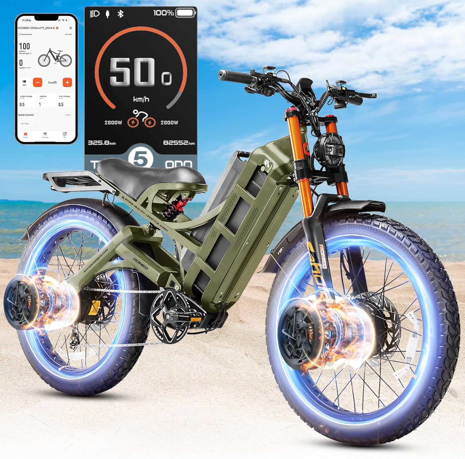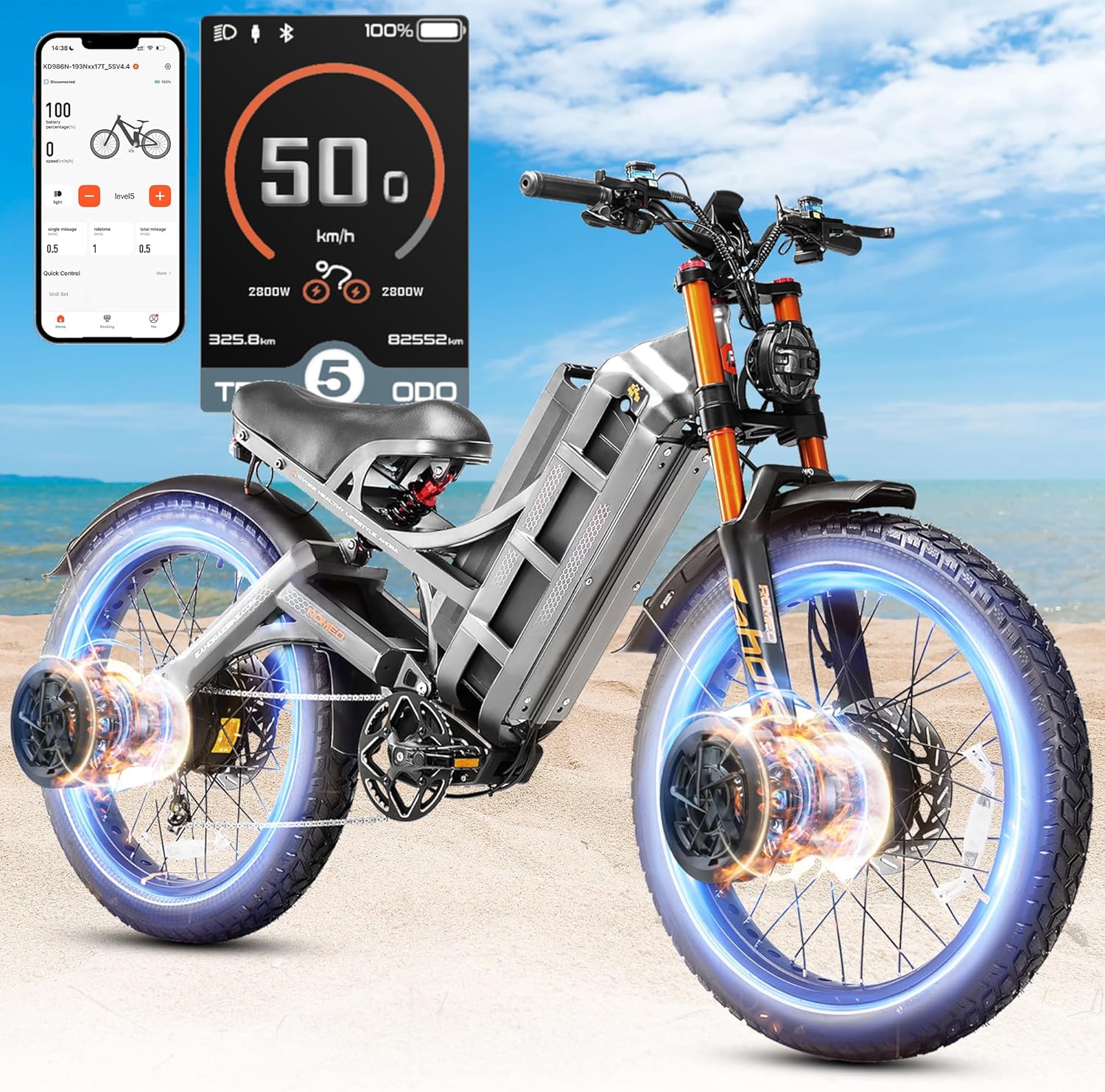 ๐Romeo Pro - Single Motor Basic Modelโ 1600W Rear Motor Ebike -- 34mphโ 48V 60Ah Removable Battery: 100-200 Miles Long Rangeโ 8A Fast Charger: 6H Fully chargedโ 26*4.0 Fat Tire - All Terrainsโ APP Controlโ Full Suspension System: Robust 80-120mm Dual-Shoulder Front Fork + Adjustable Rear Spring Shockโ 4-pistons Hydraulic Disc Brakes: 203MM*3.0T Discs๐Romeo 2 - Dual Motor Entry-Level Modelโ 2500W Dual Motor Ebike -- 40mphโ 52V 60Ah Removable Battery: 100-200 Miles Long Rangeโ 58.8V 7A Fast Charger: 8H Fully chargedโ 20*4.5 Fat Tire - All Terrainsโ APP Controlโ Full Suspension System: Robust 80-120mm Dual-Shoulder Front Fork + Adjustable Rear Spring Shockโ 4-pistons Hydraulic Disc Brakes: 203MM*3.0T Discsโ Upgraded Frame Structure: 330LBS Load๐Romeo Pro 2 - Dual Motor Cost-Effective Modelโ 4000W Dual Motor Ebike -- 46mphโ 52V 70Ah Removable Battery: 200+Miles Long Rangeโ 58.8V 7A Fast Charger: 8H Fully chargedโ 26*4.0 Fat Tire - All Terrainsโ APP Control - Bluetooth positioning, Navigation, Smart physical examinationโ Customizable Air Damper Suspension System: Air Shock (Right) + Oil&Coil Hybrid (Left) + Adjustable Rear Spring Shockโ Hydraulic Disc Brakes: Dual Oil Cups + 240MM*3.0T Discsโ Upgraded Frame Structure: 500LBS Loadโ 2000LM headlights + brake taillights + reflective strips๐Romeo Pro 3 - Dual Motor High-Performance Modelโ 5600W Dual Motor Ebike -- 50mphโ 60V 80Ah Removable Battery: 250+Miles Long Range โ 67.2V 7A Fast Charger: 8H Fully chargedโ 26*4.0 Fat Tire - All Terrainsโ APP Control - Bluetooth positioning, Navigation, Smart physical examinationโ Customizable Air Damper Suspension System: Air Shock (Right) + Oil&Coil Hybrid (Left) + Adjustable Rear Spring Shockโ Hydraulic Disc Brakes: Dual Oil Cups + 240MM*3.0T Discsโ Upgraded Frame Structure: 500LBS Loadโ 2000LM headlights + brake taillights + reflective strips