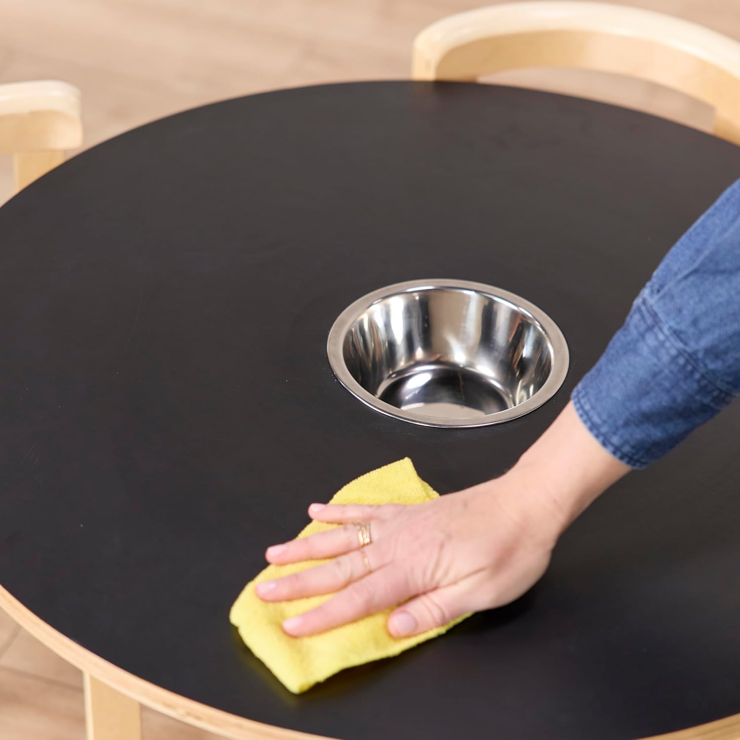 Give little artists a place to draw, color, and express their creativity with ECR4Kids Bentwood Chalkboard Table and Curved Back Chair Set. The child-sized furniture set includes a sturdy round table and four ergonomic chairs with curved back support to complement any space. The chalkboard tabletop helps foster fine motor skills and promotes collaboration and social interaction as children work together on group drawings or other writing activities. The kids’ desk is designed with a center storage bowl that keeps chalk, toys, and supplies contained and organized. This activity table and chair set allows students to easily pair up and work in small groups. Wooden chairs feature a curved backrest to encourage good posture for students. Constructed from birch plywood that is molded into shape creating a solid natural hardwood. A durable finish seals the surface and resists scratching. A UV inhibitor helps furniture resist ultraviolet light and yellowing. Natural birch plywood is extremely durable and will hold up to everyday use in daycares and preschools, great for the home. Table legs are finished with rubber boots for added stability. Chairs have felt glides to help prevent floors from scratching and reduce noise. Adult assembly required.