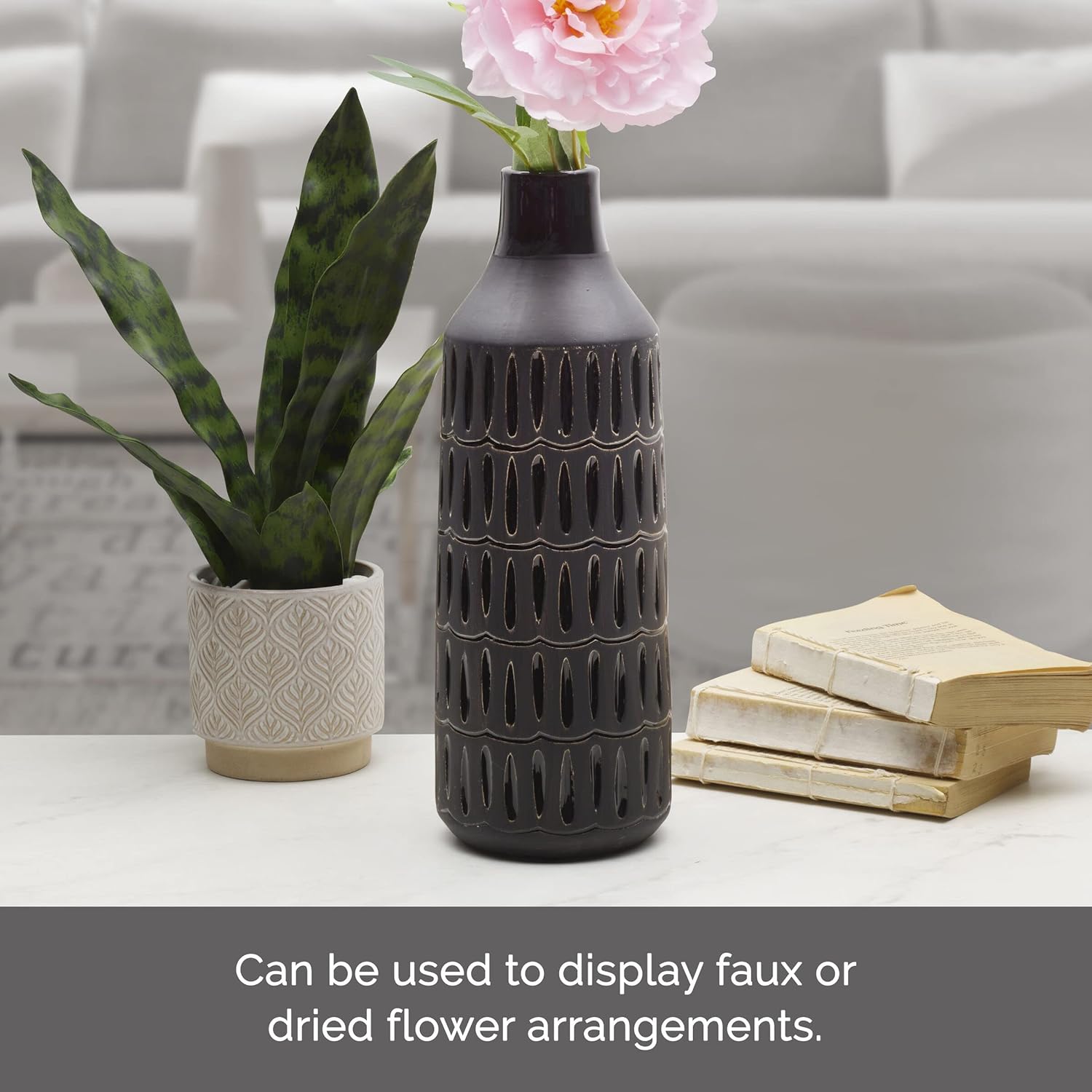 Add a touch of modern intrigue to your home dEcor with this Elements 14-Inch Black Ceramic Bottle Vase. Made of ceramic with a bold black finish, this contemporary vase features a classic bottle-shaped silhouette adorned with an intriguing vertical line pattern. It makes a striking focal piece on its own or can be used to display faux or dried flower arrangements. Not for use with real flowers; does not hold water. Measures 14 inches high by 4-3/4 inches in diameter. Wipe clean with a soft cloth.