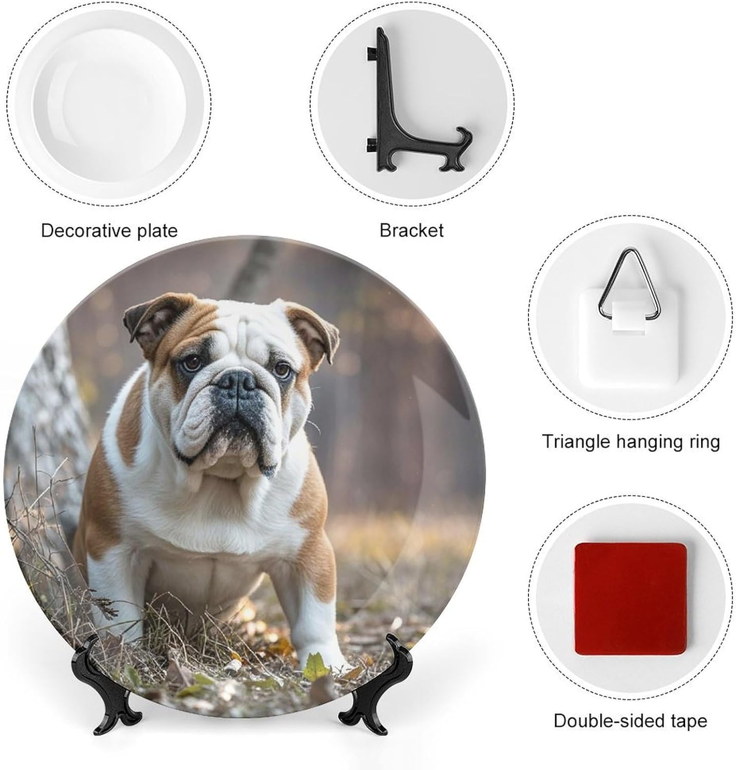 Our versatile ceramic English Bulldogs plates are made of smooth ceramic material. The lightweight bone china plates can be easily placed anywhere you like, showcasing their decorative charm.This bone china dessert plate is available in four sizes: 6 inches, 7 inches, 8 inches, and 10 inches, making it an ideal choice for display items.Personalized decorative plates, perfect for displaying handicrafts, are an ideal choice for home décor. This vertical ceramic plate makes a wonderful gift for housewarmings, anniversaries, weddings, birthdays, Thanksgiving, New Year's, or any holiday.This French country-style ceramic plate is suitable for decorating or using in living rooms, offices, hallways, dining rooms, entrances, hotels, holiday homes, and other places.