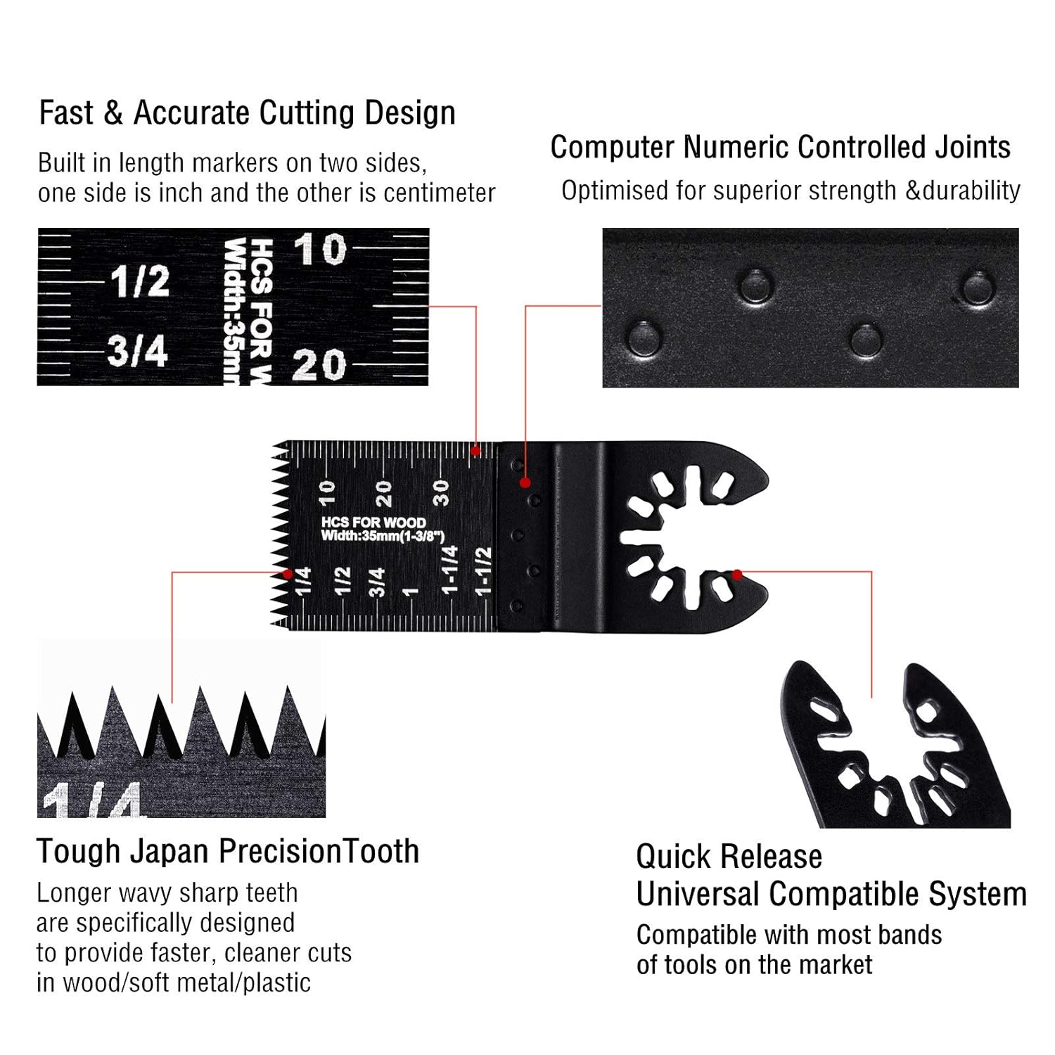 50 Pcs Professional Japan Oscillating Multitool Saw Blades MAIN FEATURE Japanese precision saw blades with longer wavy sharp tooth are specifically designed for faster and cleaner cutting. Greatly improve your working efficiency. PREMIUM MATERIAL Made of high carbon steel and High speed steel, tough enough for daily applications. LONG SERVICE LIFE: Thick gauge metals and high quality manufacturing techniques insure superior wear tolerance and durability. FAST CUTTING Japan precision saw blades have longer wavy tooth that is specifically designed to provide faster, cleaner cuts in wood/soft metal/plastic. ACCURATE CUTTING These oscillating multitool blades are built in length markers on two sides, one side is inch and the other is centimeter, ensure you can get accurate cuts easy and fast while you working with it. Compatible with: Bosch Multi-X, Bosch (except MX30) , Craftsman Nextec Multi Tool, Craftsman Nextec 17438, Craftsman Nextec 61199, Craftsman Nextec 5910, Craftsman 2702 2.0 Amp, Chicago 67256, Chicago 67537, Chicago 67538, Chicago 67707, Chicago 68303, Cougar, DeWalt, Driving Force, Falke Tool Mate, Fein Multimaster Tools, Fein Multimaster AFMM 14, Fein Multimaster FMM 250 Q,Fein MultiMaster FMM 250 Q-MS, Fein MultiMaster MOX 6-25 Pneumatic, Ferm Zwolle Holland, Genesis Multi-Purpose, HARDIN AZ318-2 250W, Haussmann 5-in-1 Multi-Purpose Tool, Ideenshop, IIT, King Canada, LongActive, Mastercraft, Master Mechanic, Matrix, MEEC Tools, Millarco prof, Milwaukee, Ozito, Power Craft, Power Duro, Pro-Line, Ridgid Jobmax, Rockwell Sonicrafter Hyperlock.
