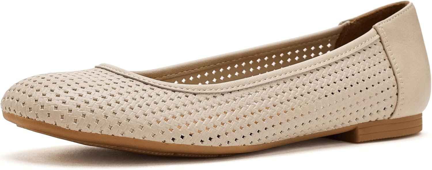 round toe, ballet flat, woven embossed upper, perforated, flexible construction