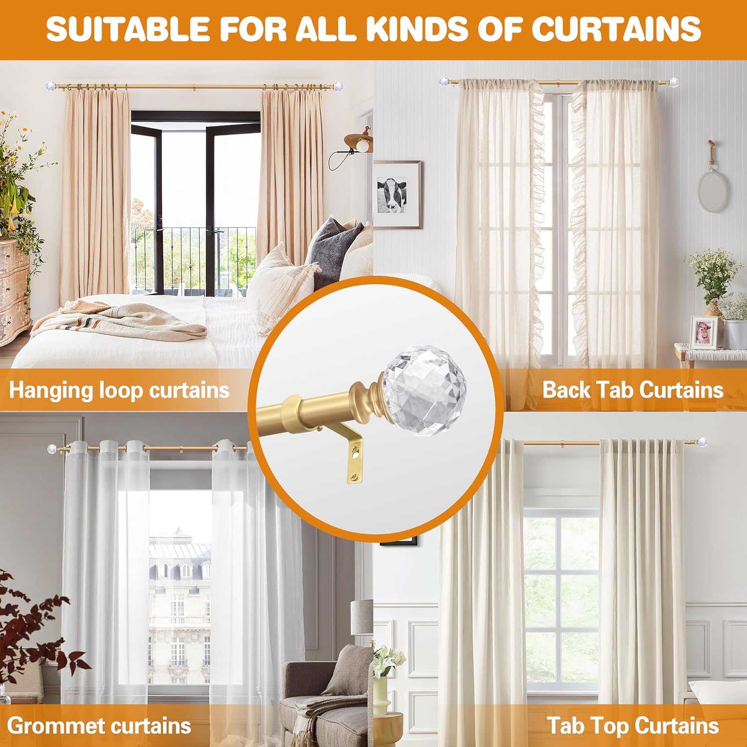 Product Highlights Adjustable Length: This curtain rod features an adjustable length, extending seamlessly from 46 to 148 inches. It's designed with a telescoping drapery rod that has four sections, providing flexibility to fit a wide range of window sizes. Elegant Design: The rod comes in a luxurious gold finish, complemented by 2 square crystal diamond finials that add a touch of opulence to any space. Complete Set: The curtain rod holders set includes everything you need for easy installation. It contains 3 curtain rod brackets, 6 screws, 6 wall anchors, and 1 metal connector. An installation instruction manual is also provided to guide you through the process. Versatile Compatibility: This blackout curtain rod is suitable for most kinds of curtains, including tab - top curtains, back tab curtains, grommet curtains, and rod pocket curtains. Quality Assurance XMH Curtain is a dedicated start - up company that focuses solely on curtain rods. We take pride in having our own factory, where each product undergoes strict quality testing to ensure durability and performance. Customer - Centric Service If you encounter any problems with our product, please don't hesitate to contact us. We value your support and suggestions as they help us improve our offerings. Dimensions and Weight The curtain pole set weighs 3.6 lbs, and it comes in an internal box sized 3943.5 inches. ☛ Click XMH curtain to explore more of our high - quality curtain rod products.