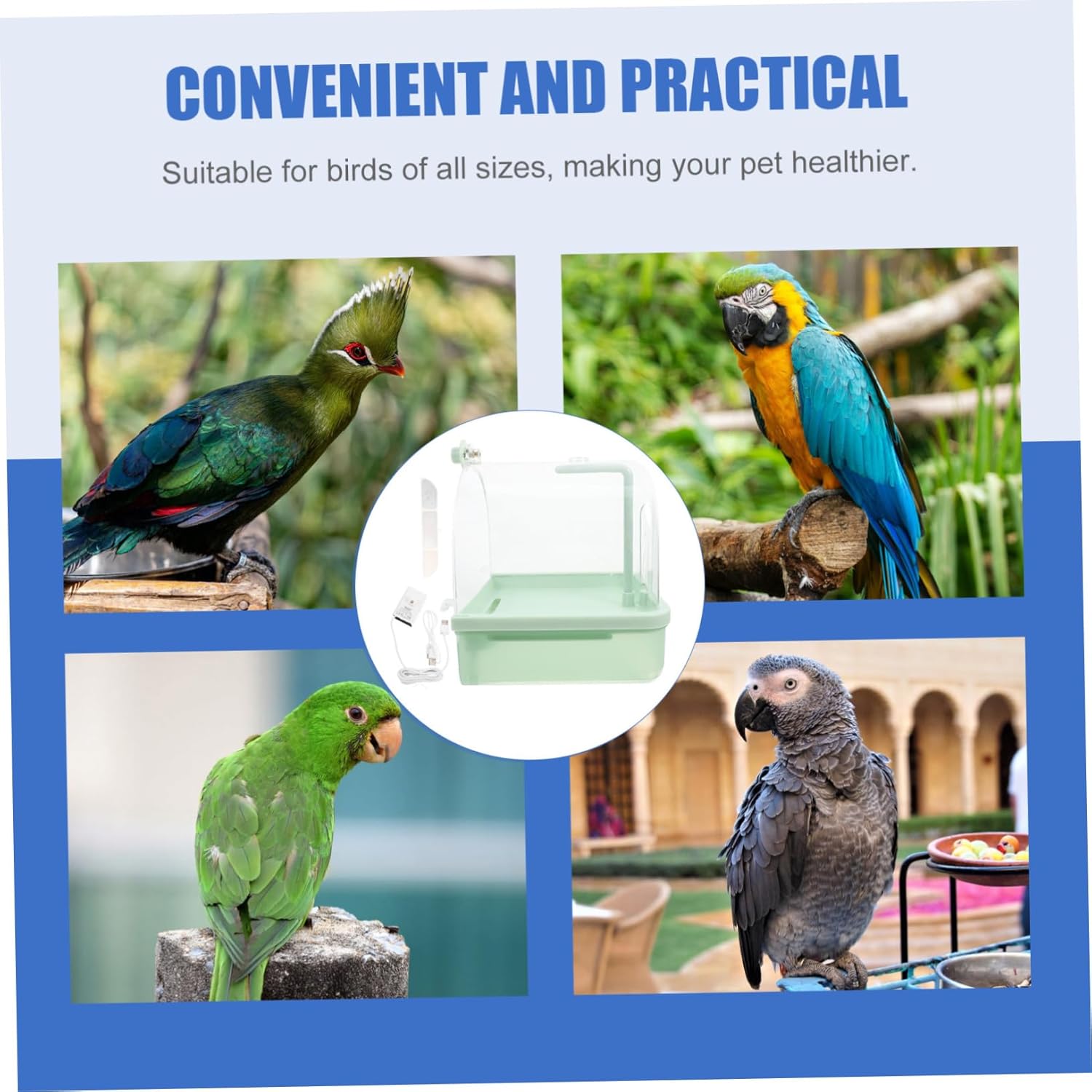 Package List 1pcs parrot automatic bathtub Features -Size:22.50X21.00X20.00cm/8.84X8.25X7.86in bird baths for cages - bath basin: the bath basin design allows for quick and simple cleaning and water replacement, ensuring bathing environment indoor bird cage -180° pivoting faucet: the 180° pivoting faucet provides a bathing experience, ensuring your bird enjoys a thorough and comfortable bath hamster cage -Training enhancement: conveniently pairs with training tools to training outcomes, making it a versatile addition to your bird care routine bird cage bath large -Material:ABS bird bath fountain -Suitable for all bird sizes: this bath is designed to accommodate birds of various sizes, from small to larger parrots, their health and happiness pet bird bath -Handsfree shower feature: the handsfree shower feature eliminates the need for manual operation, making it easier to maintain your bird's cleanliness parakeet -Color:Light Green bird nestGoods Descriptionpet bathtub Keep your parakeet or cockatiel clean and happy with this bird automatic bath shower.baths for parrots Featuring a 180° rotating faucet, this bird bath ensures a consistent and gentle flow of water, making it ideal for indoor use.pet bath Attach the bath to the outside of the cage, fill it with water, and let the automatic faucet create a delightful shower experience for your bird, and well-being