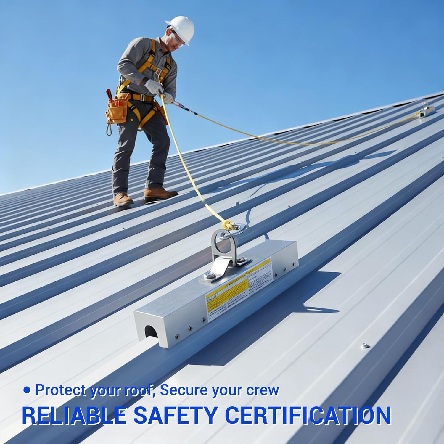 Key Selling Points:Enhanced Fall Safety: This roof anchor for fall protection provides reliable fall protection, this roof safety anchor adheres to the highest ANSI and OSHA safety standards, making it the ideal choice for roofing, construction, and maintenance workers who need dependable fall safety on the job.Non-Penetrating, Safe Design: Protect both your workers and your roof! The non-penetrating design prevents damage to the roof material while providing a secure anchoring point. This makes it a practical solution for a wide variety of roof types and ideal for long-term use.Portable, Lightweight & Reusable: Easy to transport between jobs, this Roof Anchor’s lightweight design reduces the physical strain on workers. Plus, its reusable nature reduces costs and ensures continued safety without the need for constant replacements.Product Specifications:Material: Aluminum alloy (anchor body), Stainless steel (set screws and anchor point)Weight: 4.6 lbsLoad Capacity: 5,000 lbs (Meets ANSI & OSHA standards)Compatible Roof Type: Steel standing seam panels, minimum 24-gauge thicknessCompliance Standards: ANSI Z359.1:2007, ANSI A10.32-2012, OSHA 1926 Subpart M, 1910Installation: Includes interchangeable D-ring mount, bolts, and washers