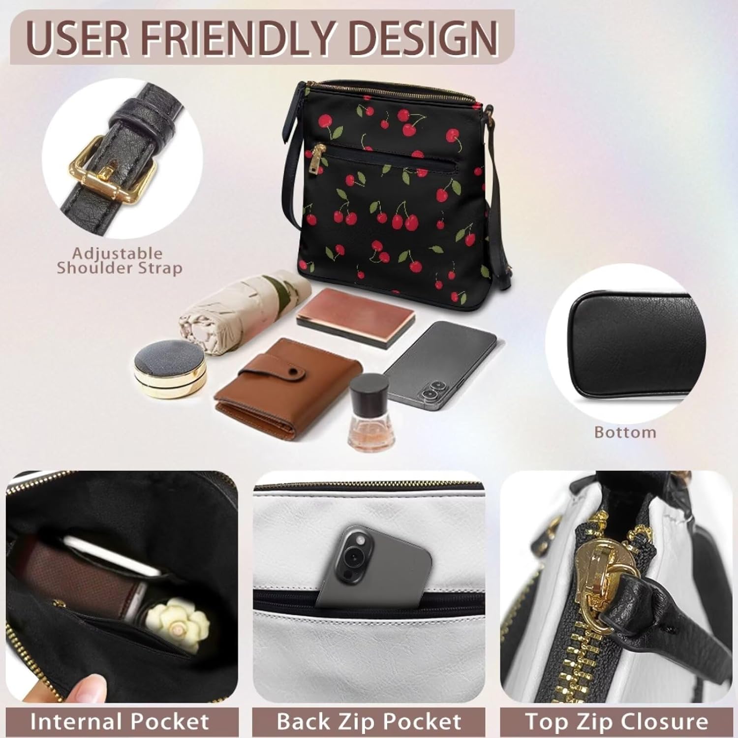 Features: 1)Adjustable shoulder strap (18.11"–21.46") ensures customized comfort for all-day wear. 2)Multiple pockets (internal, back zip, front zip) enable organized storage for phones, wallets, and daily essentials. 3)Sturdy craftsmanship with sleek styling suits work, travel, and casual occasions.