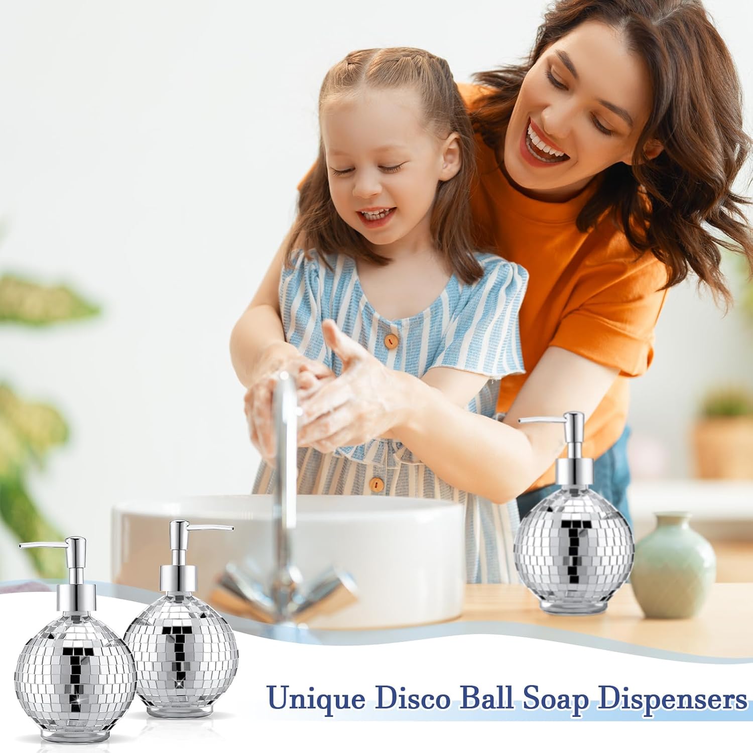 Features: The disco ball glass soap dispenser not only serves its purpose by conveniently dispensing soap but adds a stylish element to your bathroom decoration. Its unique disco ball design is eye catching and instantly uplifts the aesthetics of any space. The disco ball soap dispenser is resistant to damage, reducing the need for frequent replacements. Plus, the material is easy to clean, allowing you to maintain its shine and brilliance without much effort. The pump is strong and dispenses soap smoothly, enhancing the user's experience. Specifications: Material: textured glass lenses on the surface and glass insideColor: silverSize: about 6.3 x 4 inches/ 16 x 10 cm, and 14 oz in capacityPackage includes: 2 x Disco ball glass soap dispenserNotes: Manual measurement, please allow slight errors on size. The color may exist a slight difference due to different screen displays.