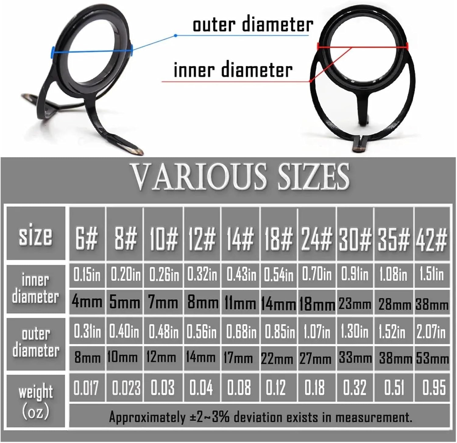 Rod Guides Tip Repair Kit:The fishing rod guides tips are made of stainless steel frame with ceramic ring, 10 sizes eyelets meet the various types of fishing rods owned by professional anglers.Both freshwater and saltwater/sea fishing are available.The fishing rod guides and tip tops both have smooth ceramic ring that reduces damage to the line and makes your fishing line less prone to breakage. The design with curved double-legs makes the rod guides more stable than ordinary rod guides.Fits Most Rod Types:Suitable for repairing all kinds of fishing rods, including spinning rod, bait casting rod, fly rod and telescopic rod etc.The fishing rod guide and tips are the things that determine the distance and accuracy of your rod control. It makes your fishing rod more responsive.