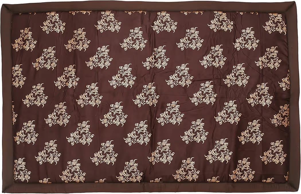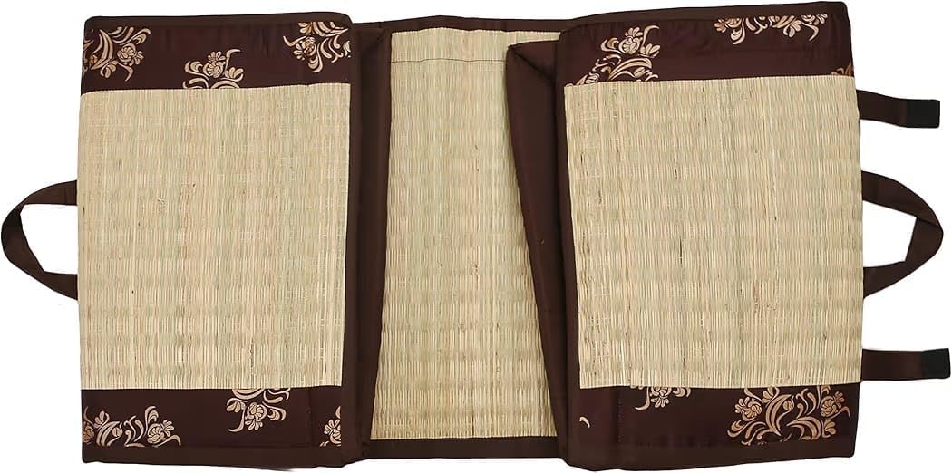Transform your sleeping experience with this elegant 4x6 feet sleeping mat featuring a sophisticated brown border adorned with intricate floral patterns. The mat combines traditional craftsmanship with modern comfort, offering a perfect blend of style and functionality. The natural-colored center portion is meticulously woven to provide optimal support, while the decorative brown edges with beige and white floral motifs add a touch of elegance to any room. The mat includes convenient carrying handles for easy transportation and storage. The cushioned design ensures comfort whether used for sleeping, meditation, or casual lounging. The durable construction maintains its shape and appearance with proper care, making it an ideal choice for both daily use and occasional guests. Perfect for homes, meditation centers, or as a portable sleeping solution. Spot clean only to maintain the mat's quality and appearance.