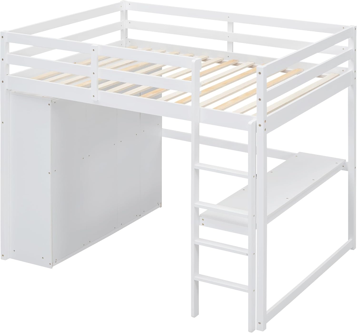 Designed to provide all-in-one furniture functionality, this loft bed with desk and wardrobe is the ideal space-saving solution for smaller bedrooms. Its expert design incorporates a sleep space, study area, and ample storage, making it perfect for those who desire practicality and style. Description Material:Pine Wood+MDF Size:Full Color:White/Gray Numbers of Package:2 Spring Box:No need Assembly Required:Yes Origin:Vietnam Dimensions Overall Product Dimension:79.5''L x 57''W x 67.5''H Full Bed:76'' x 54.5'' Total Height:67.5'' Recommend Mattress Thickness of Bed:6'' Overall Product Weight:241lbs Bed Weight Capacity:350lbs