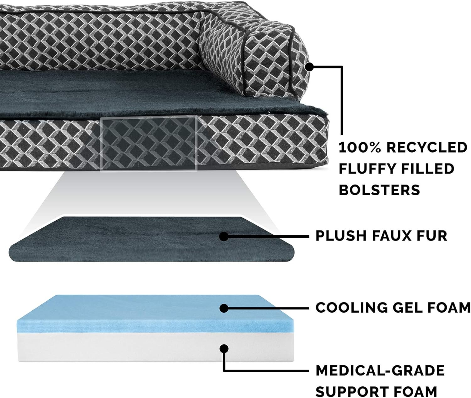 Perfect for cats and dogs of all ages, the Furhaven Comfy Couch Plush & Decor Sofa-Style Dog Bed is a short-sided pet sofa that is sure to be your pet’s favorite new snuggle spot. The medical-grade foam core includes a layered orthopedic foam core topped with gel-infused memory foam. Micro gel beads help keep the bed cooler while memory foam conforms to your pet's shape providing superior support of joints and pressure points. Gel foam has cooling properties reducing the sleeping surface by 1 or 2 degrees, wicking heat away from your pet. The superior support provided by both foam cores will help your pet reach a deeper, more restorative rest for your pet's health. Soft-sided walls provide bolstered support on both edges and the back of the bed, allowing your pet to relax into comfort with their back and hips supported. The side bolsters also offer the perfect pillow for your pet to rest its head, allowing for better spinal alignment and neck relief. Bolsters are filled with 100% recycled fluffy fill. Sofa’s gusset and bolsters feature a groovy diamond print design and matching plush faux fur sleep surface that is oh-so-soft on noses and paws. Available in various stylish colors and diverse sizing options, you are sure to find a purrfect fit for your pet. Easy to clean. Cover care: Remove from core before washing (see seam label for fabric care instructions). Foam care: Cooling gel foam is highly absorbent. Spot clean with mild soap or enzyme-based cleaning spray. Rinse but DO NOT SOAK OR SUBMERGE. Press out moisture with a dry towel and air dry. A fan may be used to speed drying. Do not wring or place in machine dryer. Dry completely before use. Not for unsupervised use by animals with destructive chewing behavior.