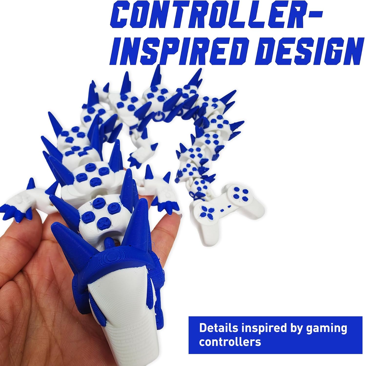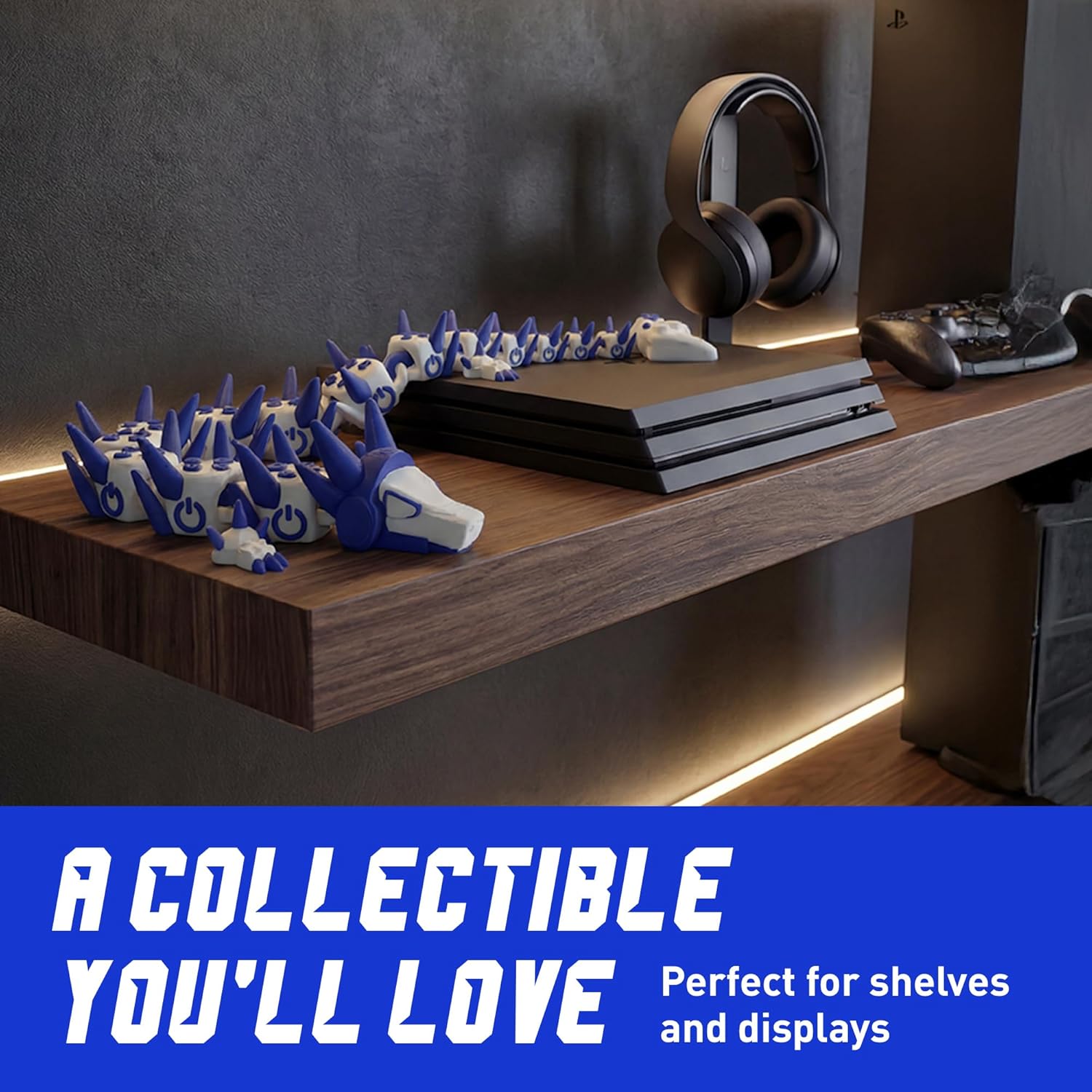 Level up your desk setup with the Flipp 3D Gamer Dragon — a fully articulated, poseable figure inspired by the look and feel of classic game controllers. Each sculpted segment echoes familiar gamer buttons and joystick details, creating a bold, tech-forward collector piece that feels right at home next to your favorite console or PC rig. Designed for ages 14 and up. Built as both a display figure and a satisfying desk fidget, this dragon features a flexible, segmented body that bends, twists, and coils into endless custom poses. Wrap it around a controller stand, curl it along your monitor, or display it on your shelf as a collector accent for your gaming space. The Gamer Dragon is 3D printed in durable, lightweight PLA plastic, delivering smooth-moving joints and a satisfying articulated feel. Two gamer-inspired colorways — a sleek dark console theme and a bold high-contrast version — let you match your dragon to your personal setup aesthetic. The perfect gift for gamers, streamers, dragon figure collectors, and fidget accessory fans, the Flipp 3D Gamer Dragon is a one-of-a-kind desk companion and display piece. Add it to your gaming room, home office, or collector shelf and bring your love for gaming, dragons, and 3D art together in a single eye-catching figure.