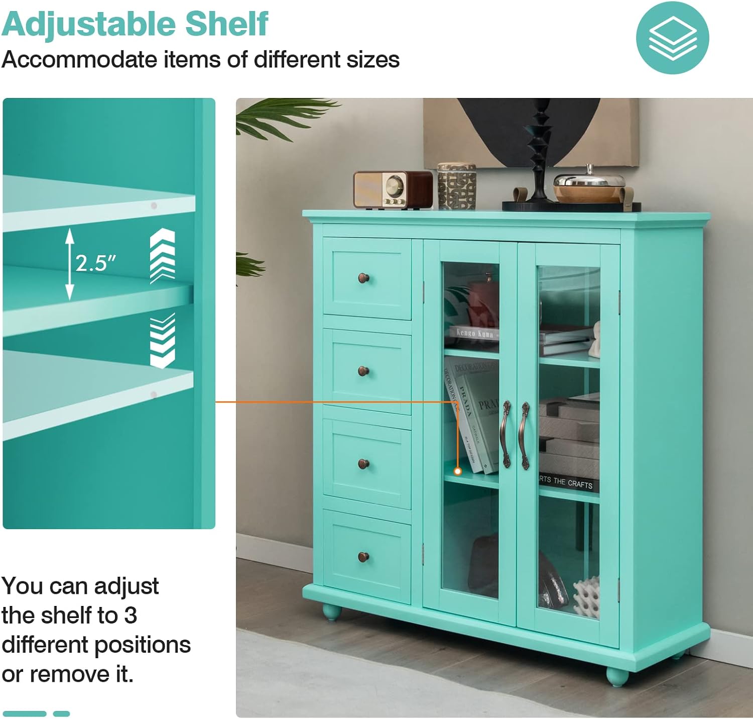 Description: Choose our buffet sideboard with exquisite design. Choose a convenient and high-end life style! Featuring a wide countertop, 4 pull-out drawers and an enclosed cabinet, the buffet sideboard offers ample classified storage space for your tableware, wine, glass, books, etc. You can also adjust the lower shelf to 3 different positions or remove it to expand storage height for different items. In addition to the storage function, the appearance of the sideboard is also worth mentioning. The antique drawer knob and classic metal handles add a touch of vintage flair to the cabinet. Features: Spacious countertop to place small appliances and showcase ornaments 4 deep drawers are ideal for classifying different kinds of tableware Enclosed cabinet with doors to keep items clean and orderly Smooth drawer slides and round knobs for easy opening and closing 3-position adjustable shelf allows you to customize storage spaces Sturdy construction for great durability and loading capacity Anti-toppling device prevents the cabinet from tipping over Suitable for kitchen, dining room, living room, entryway Specifications: Material: MDF, Tempered Glass Overall Dimension: 36” x 12” x 37”(L x W x H) Inner Size of Each Drawer: 8.5” x 9.5” x 5” (L x W x H) Front Panel Size of Each Drawer: 10.5” x 5.5”(L x H) Upper Shelf Size: 21.5” x 10” x 9.5” (L x W x H) Height from Bottom Shelf to Upper Shelf: 22” Door Size: 10” x 32”(L x H) Clearance from Ground: 2” Net Weight: 73 lbs Weight Capacity of Countertop: 180 lbs Weight Capacity of Each Drawer: 15 lbs Weight Capacity of Each Shelf: 40 lbs Package Includes: 1 x Buffet Sideboard 1 x Instruction