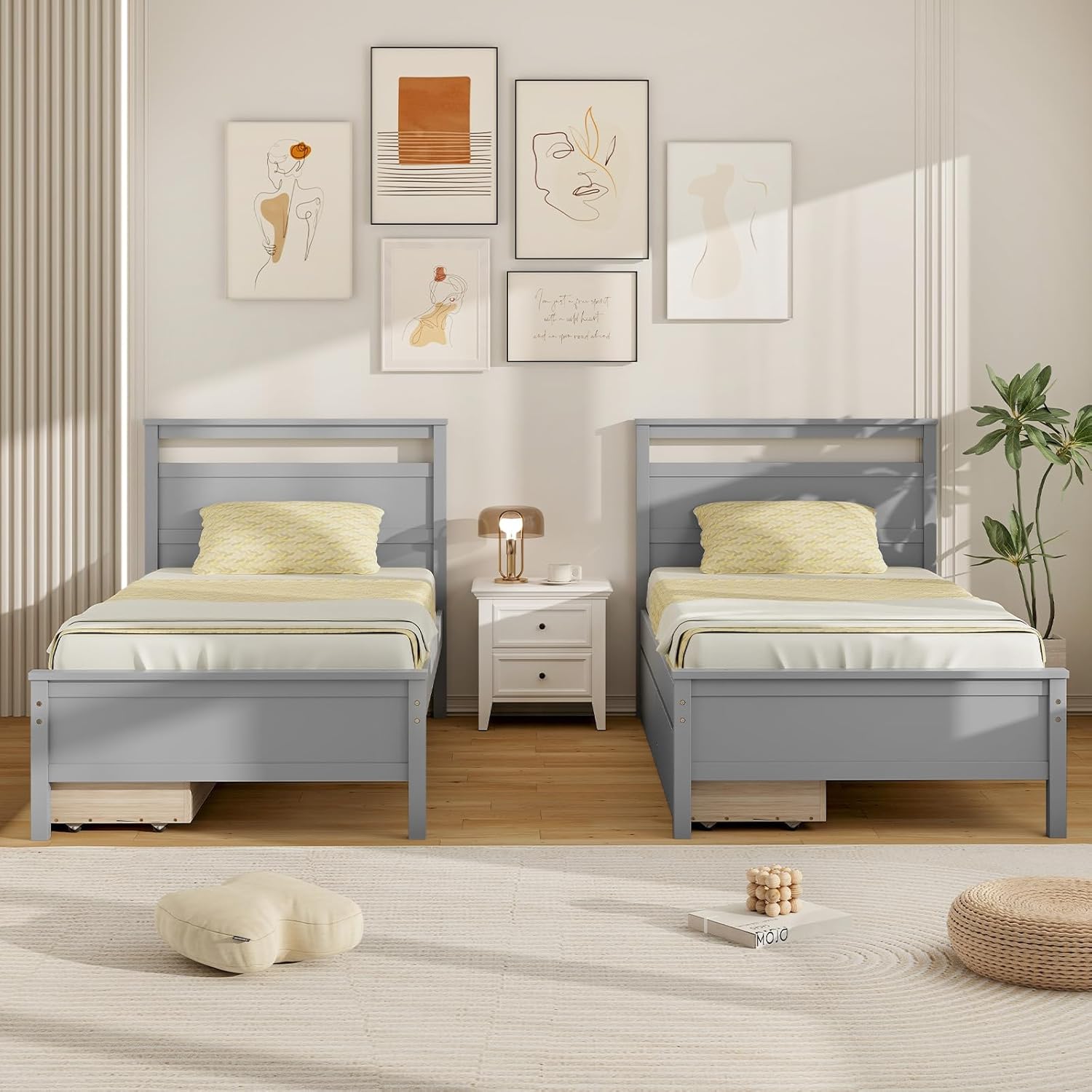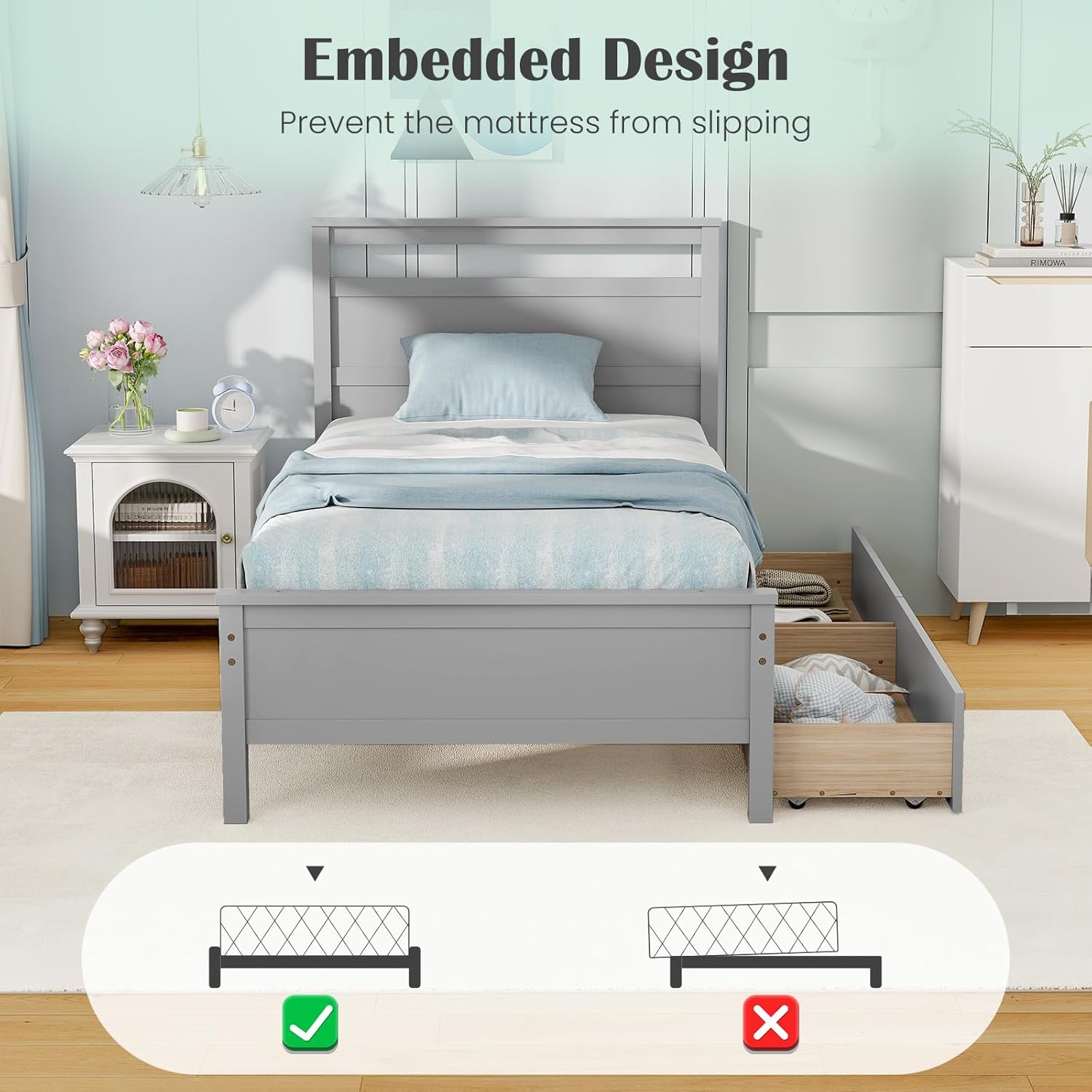 Description: Revamp your bedroom with this contemporary bed frame, combining storage convenience and elegance effortlessly. Benefit from the strong weight capacity of this bed, supported by sturdy plywood slats and pine wood frame that provide exceptional support and reliability. Moreover, the platform bed features 2 large pull-out drawers that provide a practical and space-saving solution for your bedroom essentials. The stylish headboard and footboard design adds a contemporary flair to your room. Whether you are refurbishing your master suite or furnishing a guest room, this modern platform bed is an ideal choice. Features: Reliable plywood slats provide strong support for the bed frame Solid pine wood frame ensures high strength and long service life Sturdy support legs improve overall stability 2 drawers are available in both sides and meet daily storage needs Thoughtful drawer stoppers keep the drawers in place Each drawer comes with smooth rolling wheels for easy movement Modern platform bed with headboard adds a different flair to your home Embedded design to keep mattress from slipping Suitable for bedroom, guest room, dorm, or apartment, etc Can be used with twin size mattress, no box spring needed Specifications: Color: Gray/White Material: Plywood, Pine Wood, MDF Overall Dimensions: 80" x 42" x 41.5"(L x W x H) Dimensions of Drawer: 36" x 15" x 5"(L x W x H) Height of Footboard: 18" Weight Capacity of Bed: 200 lbs Weight Capacity of Drawer: 50 lbs Recommended Mattress Thickness: ≥6" (Not Included) Net Weight: 70.5 lbs Package Includes: 1 x Platform Bed 1 x User Guide