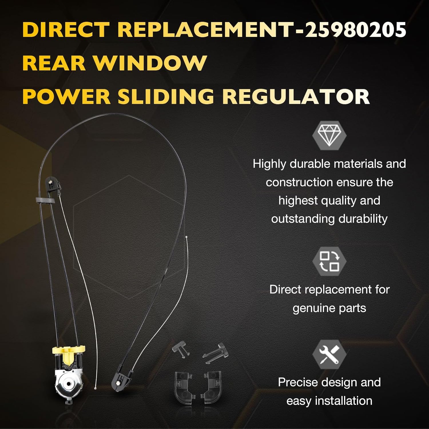 Product DescriptionCondition: 100% brand newColor: BlackMaterial: plastic + metalPosition on the vehicle: Rear Power Sliding Window Regulator Installation: Direct ReplacementOE No: 25980205 Compatible with Chevrolet:2007-2013 Chevrolet Silverado 15002007-2013 Chevrolet Silverado 2500 HD2007-2013 Chevrolet Silverado 3500 HDCompatible with GMC:2007-2013 GMC Sierra 15002007-2014 GMC Sierra 3500HDFeatures1) Meets OEM specifications.2) Match perfectly with OEM.3) Easy to install. Can be directly replaced.4) Stable performance and high reliability.5) Manufactured and tested under strict quality control standards.Notes:All dimensions are measured manually and may have slight deviations.Colors may vary slightly due to the different color settings of each monitor.Please carefully check the above part photos, part numbers (original matching part numbers of your old parts), part descriptions, and compatibility charts and compare them with your old parts to make sure it is the part you need.If you have any questions, please contact us.