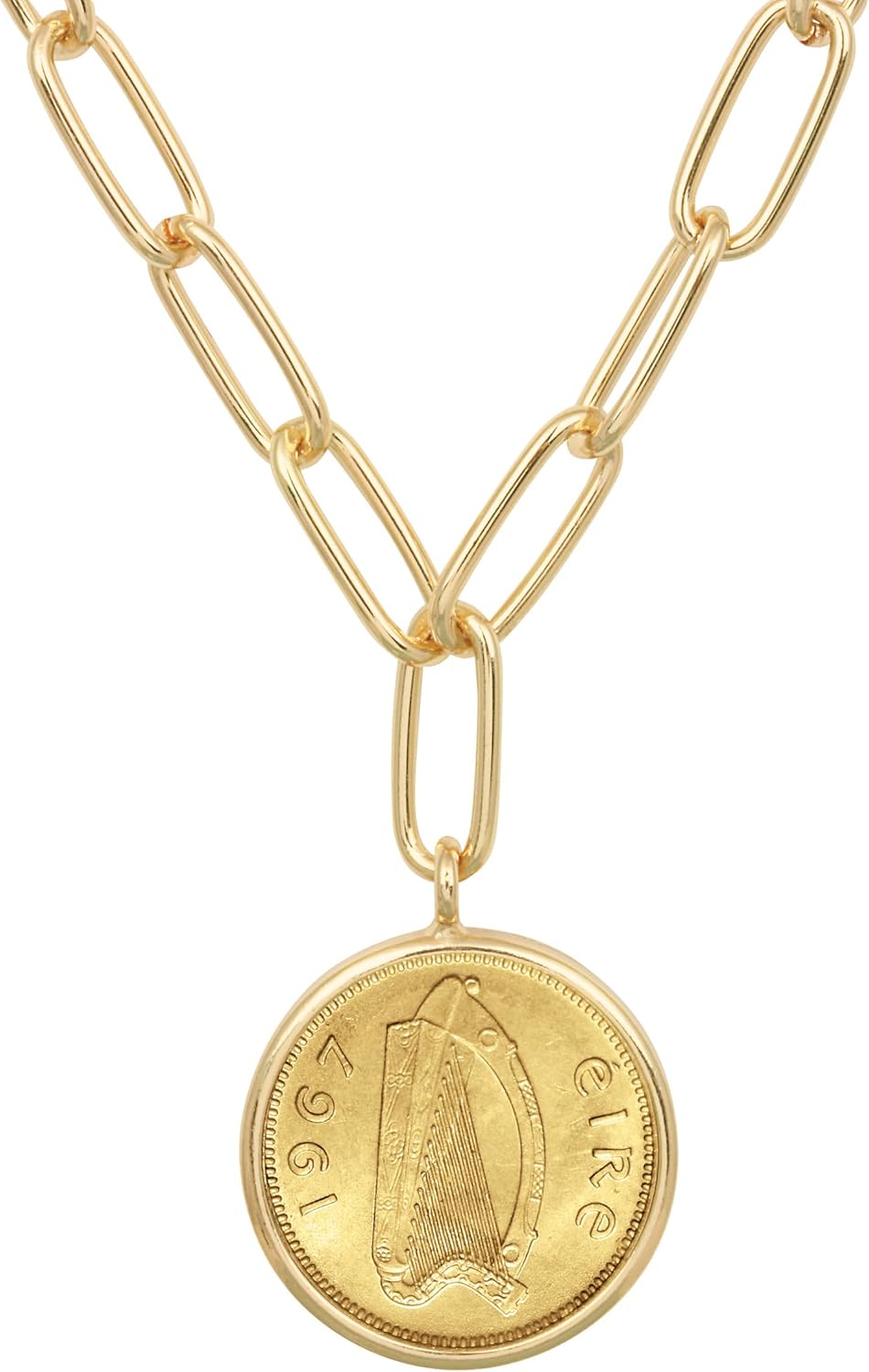 The lucky Irish threepence coin features a rabbit with the words "leat reaul" which means half a sixpence and is the focus of this stylish necklace. The bezeled coin hangs from an 18 inch paperclip style goldtone chain with a 3 inch extender and a lobster claw clasp. The necklace comes in a white jewelry box and includes a Certificate of Authenticity. All years and mint marks will vary.