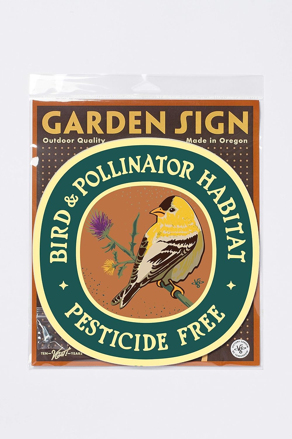 It’s as simple as a Goldfinch on a thistle. This year, play host to all the bees, butterflies and other flying pollinators in your yard. Let others know that you cultivate flowering plants to support the important work that pollinators do for us. Made of a composite aluminum and polyethylene, and printed with a hard-cured ink, this durable sign will last for years outside and in the weather. It will look fine on a stake, on the shed or on the barn. Predrilled for mounting holes, screws provided, centered. SIZE: 9 in. dia. MATL: Aluminum-polyethylene sign panel PRINTED in Portland, Oregon DESIGNER: Joe Wirtheim