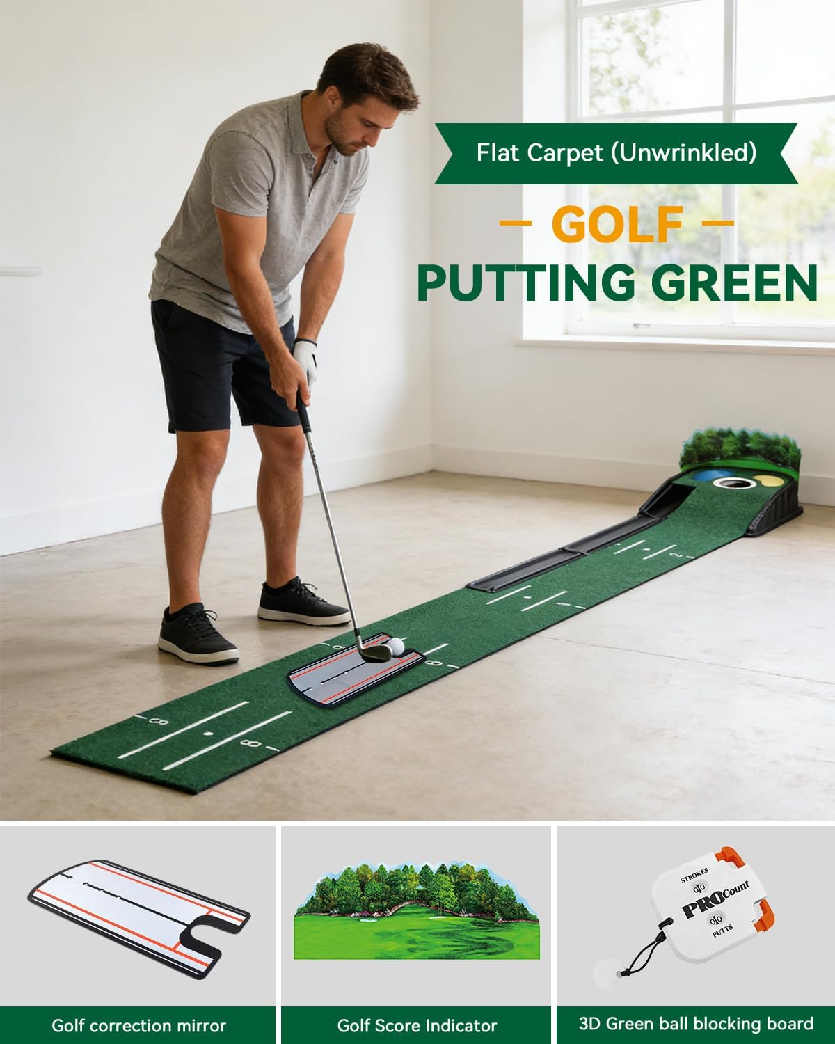 9ft Golf Putting Green Set for Indoor Practice and Stroke Improvement With two golf balls This golf putting green indoor practice set is designed to help golfers build confidence and consistency on the green. The 9 ft putting mat provides ample length for realistic putt practice, helping improve distance control, accuracy, and overall putting performance. The included alignment putting mirror allows players to correct eye position and stroke path, making it easier to develop proper putting form. A stroke counter adds structure to practice sessions, turning routine drills into engaging putting games that track progress over time. Suitable for home, office, and indoor practice, this putting green mat set is portable, easy to set up, and enjoyable for golfers of all levels. Whether you’re practicing alone, playing a mini putting game, or looking for a thoughtful golf gift, this complete putting practice set delivers both training value and fun.