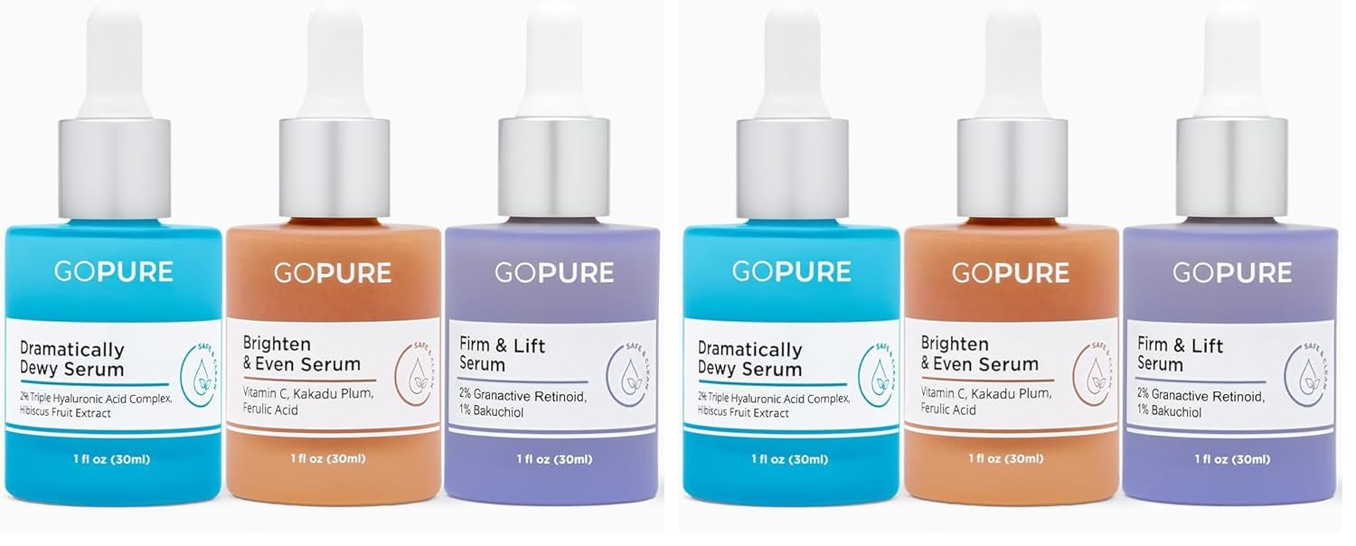 Experience the ultimate transformation with the goPure Actives Skin Care Set. This skin care set combines three super serums, including our Vitamin C Serum and Hyaluronic Acid Serum for face, to address multiple skin concerns. Boost radiance with our skin brightening serum that diminishes the appearance of dark spots and discoloration. Hydrate and smooth your skin with our hydrating serum formulated with Triple Hyaluronic Acid and Vitamin E, and firm and lift the appearance of sagging skin with our firming face lift serum infused with Retinol and Bakuchiol. Complete your routine with our advanced Glyco-Peptide Anti Wrinkle Moisturizer, a lightweight and nourishing face moisturizer for dry skin that helps reduce the appearance of wrinkles and provides intense hydration. This anti-aging skin care set is perfect for those looking to plump, and revitalize their skin. It also includes our Vitamin C Ferulic Acid Serum and a sensitive skin moisturizer for a comprehensive and effective skincare regimen.