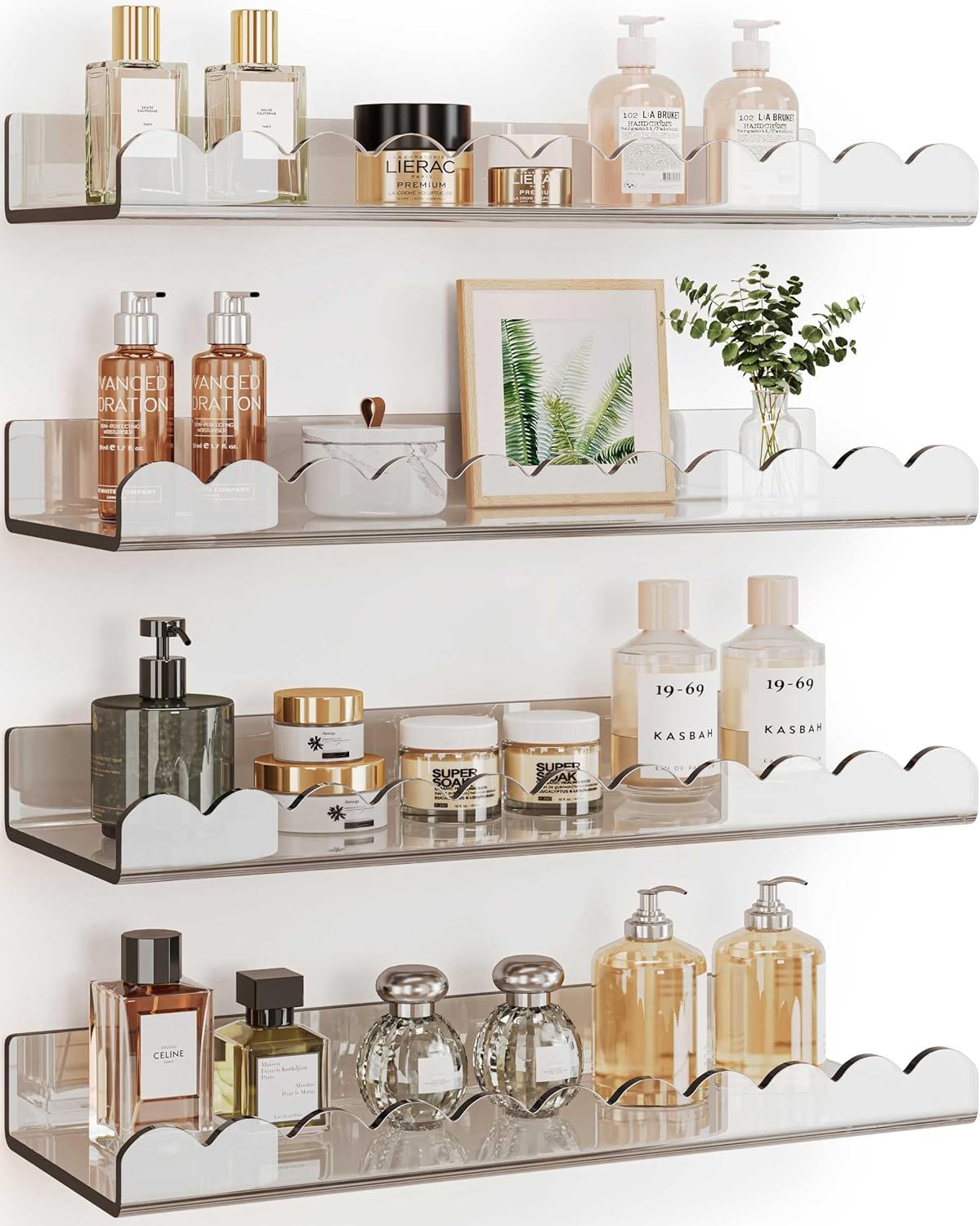 Upgrade Your Space with Crystal-Clear Floating Shelves Discover the perfect blend of functionality and modern aesthetics with our transparent acrylic shelves. These innovative floating shelves create the illusion of your items magically suspended on the wall, offering a sleek storage solution that complements any room's decor. Key Features: Space-Saving Design: Maximize your vertical space with our multi-layer storage solution Crystal-Clear Appearance: High-transparency acrylic maintains visual cleanliness Surprising Durability: Thick acrylic construction supports up to 8.8 lbs per shelf Effortless Installation: Complete with all hardware for quick setup Universal Application: Perfect for bathroom, bedroom, kitchen, or living room Perfect For: Display your perfume collection, organize skincare products, showcase favorite decor pieces, or create an elegant makeup station. The versatile design works beautifully as bathroom organizers, bedroom shelves, or living room display shelves. What's Included: 4 x Clear Acrylic Shelves (23" x 4") Full Mounting Hardware Set Easy-to-Follow Instructions Transform your space today with these invisible shelves that keep your essentials organized while maintaining a clean, modern look. The complete 4-pack offers exceptional value for your entire home organization needs.