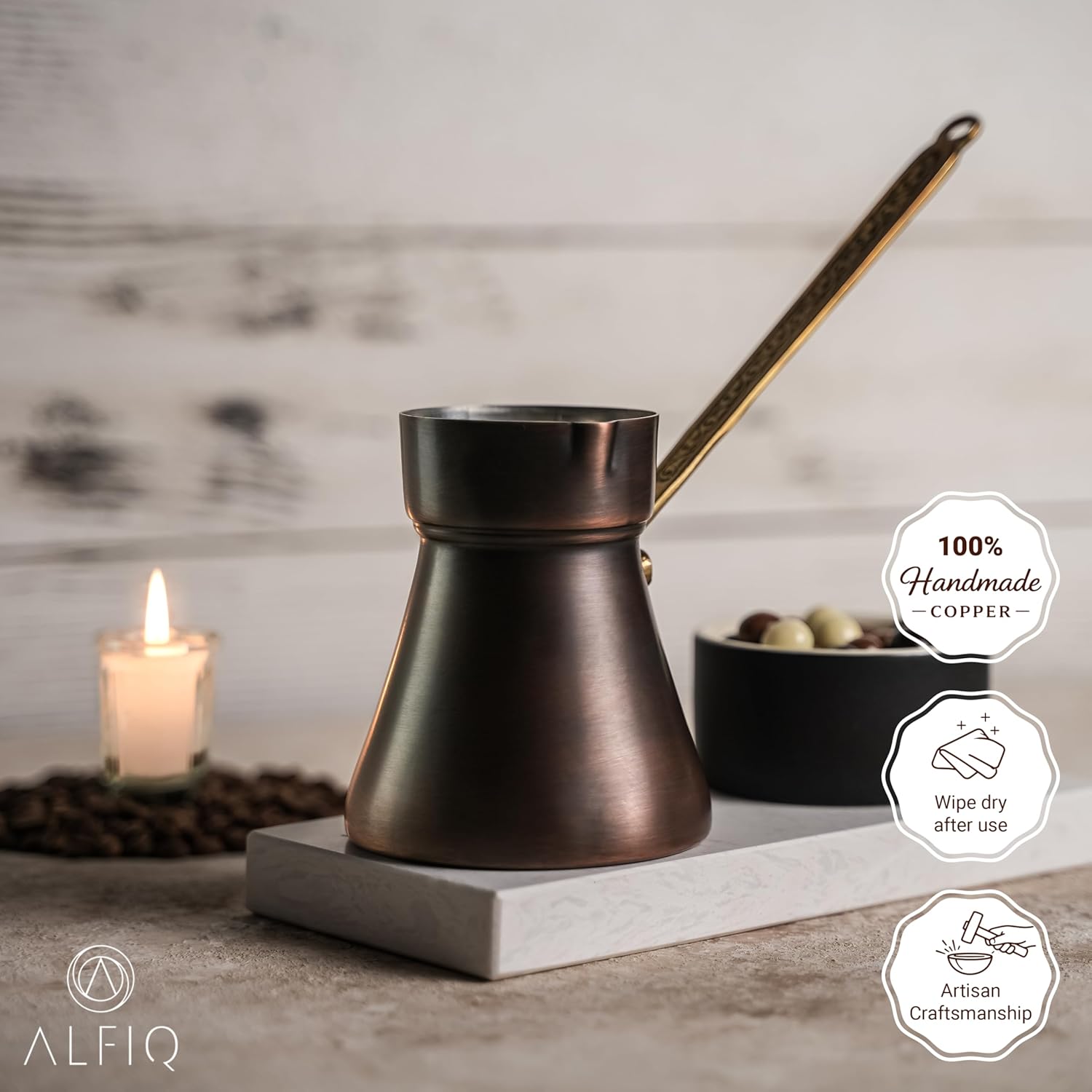 Authentic Copper Construction Brew traditional recipes with the ALFIQ handcrafted dark copper Turkish coffee pot. Manufactured from heavy duty 100% pure copper, this cezve delivers maximum thermal conductivity for precise temperature control. The interior is coated with a food safe tin lining to prevent oxidation and protect the flavor profile of your Arabic or Greek coffee.Engineered for Foam Generation The geometric design features a wide base and a strategically narrow neck. This specific structure accelerates the brewing process and forces microbubbles to the surface, generating the thick foam essential for authentic Turkish coffee. An extended ergonomic handle provides secure balance and protects hands from direct stovetop heat.Optimal Capacity and Maintenance With an 8.5 ounce volume, this copper coffee maker efficiently brews 2 to 3 standard demitasse cups simultaneously. Maintain the structural integrity and dark copper finish by hand washing with warm water and non abrasive soap. The solid construction guarantees long term performance for daily brewing setups.