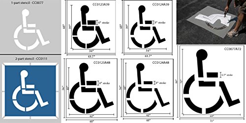 Handicap parking lot stencil measures 36 in. high by 19.3 in. wide and comes on 1-piece of plastic. Stencil is designed to lay flat on pavement and can be used to mark hundreds of parking spaces. The 36 in. Handicap stencil is a common item for any line striper or parking lot painter to have on the job site. It can be used to paint new or in some cases paint over existing symbols that are faded.