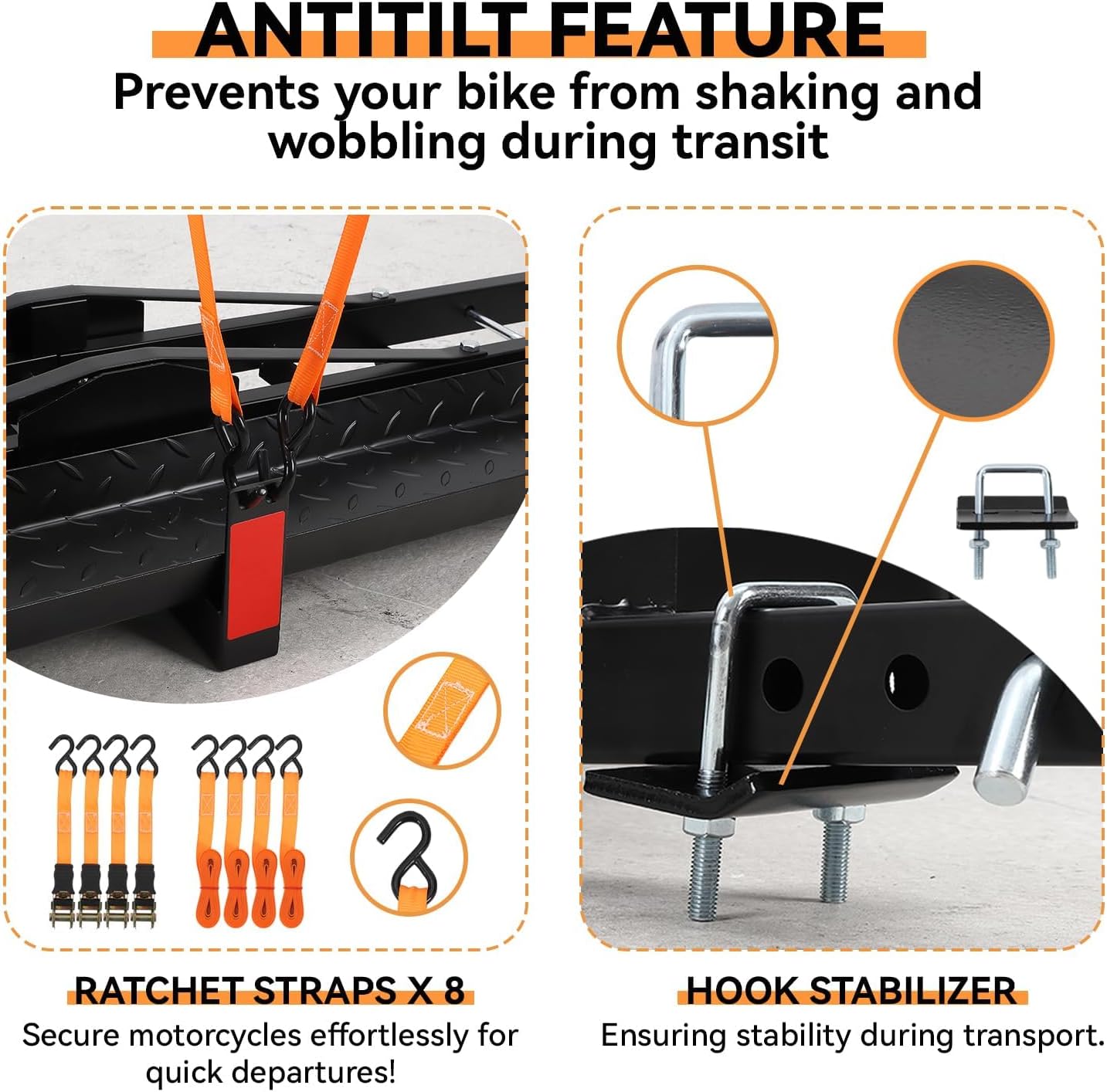 Introducing the Motorcycle Carrier, designed for those who seek adventure on two wheels without the hassle of transportation. This robust carrier not only provides high-capacity hauling for dirt bikes and bicycles but also ensures stability and safety during transit.Constructed from reinforced carbon steel, our motorcycle carrier is built to withstand heavy loads while remaining lightweight and easy to handle. The built-in ramp conveniently stores with the carrier, allowing for efficient space management and quick access whenever needed.Worried about the elements? The motorcycle carrier features a rust-resistant coating, ensuring longevity and reliability against rain and moisture. Its universal 2" square hitch receiver makes it compatible with a wide range of vehicles, including sedans, SUVs, and trailers, so you can hit the road without delay.Safety is paramount, and our anti-shake safety lock is designed to keep your load stable, even on bumpy terrains. The removable dual ramps come with quick-release screws, making loading and unloading a breeze, so you can spend less time setting up and more time enjoying your ride.Installation is straightforward with pre-aligned holes and clear guides, allowing for a tool-free setup. Conduct basic safety checks before loading to ensure your motorcycle is ready for the journey ahead.Moreover, our complete accessory kit includes four reinforced straps and a ramp storage bag, ensuring secure transport without the need for additional purchases. Experience the convenience and reliability of our Motorcycle Carrier, and take your adventures wherever the road leads you.