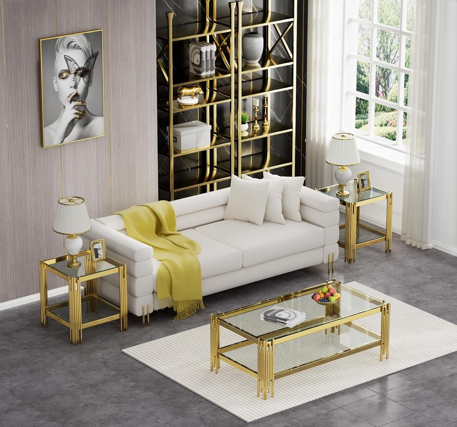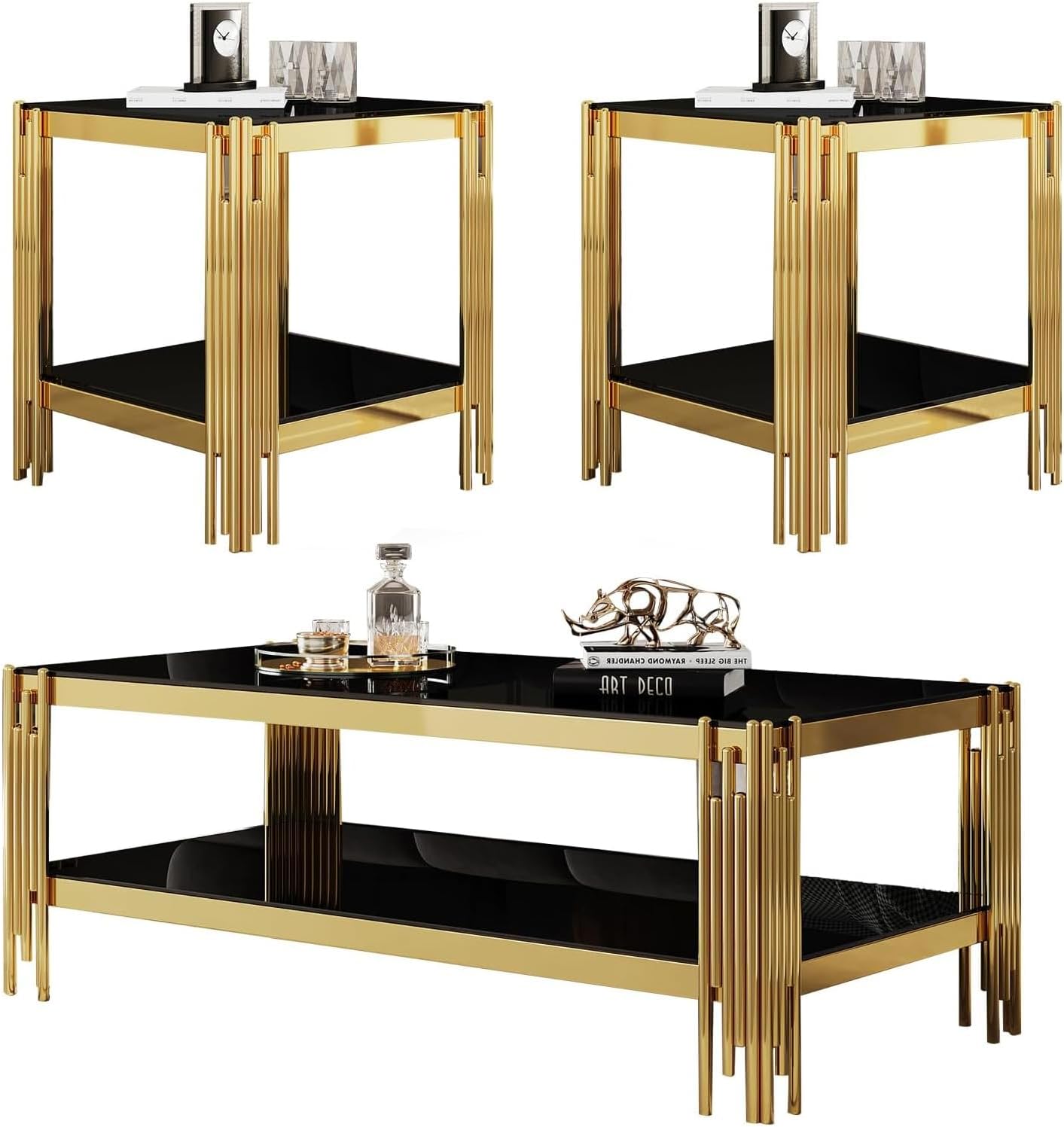2-Piece Luxury Gold Glass Living Room Table with Gold Legs Coffee Table Dimensions: 23.6"D x 47.2"W x 17.7"H End Table Dimensions: 19.68"D x 19.68"W x 21.6"H Style: Modern Top Material: Tempered Glass Frame Material: Metal Coffee Table Weight: 77 Pounds End Table Weight: 33.44 Pounds Number of package: 3