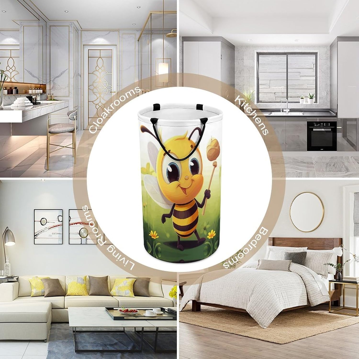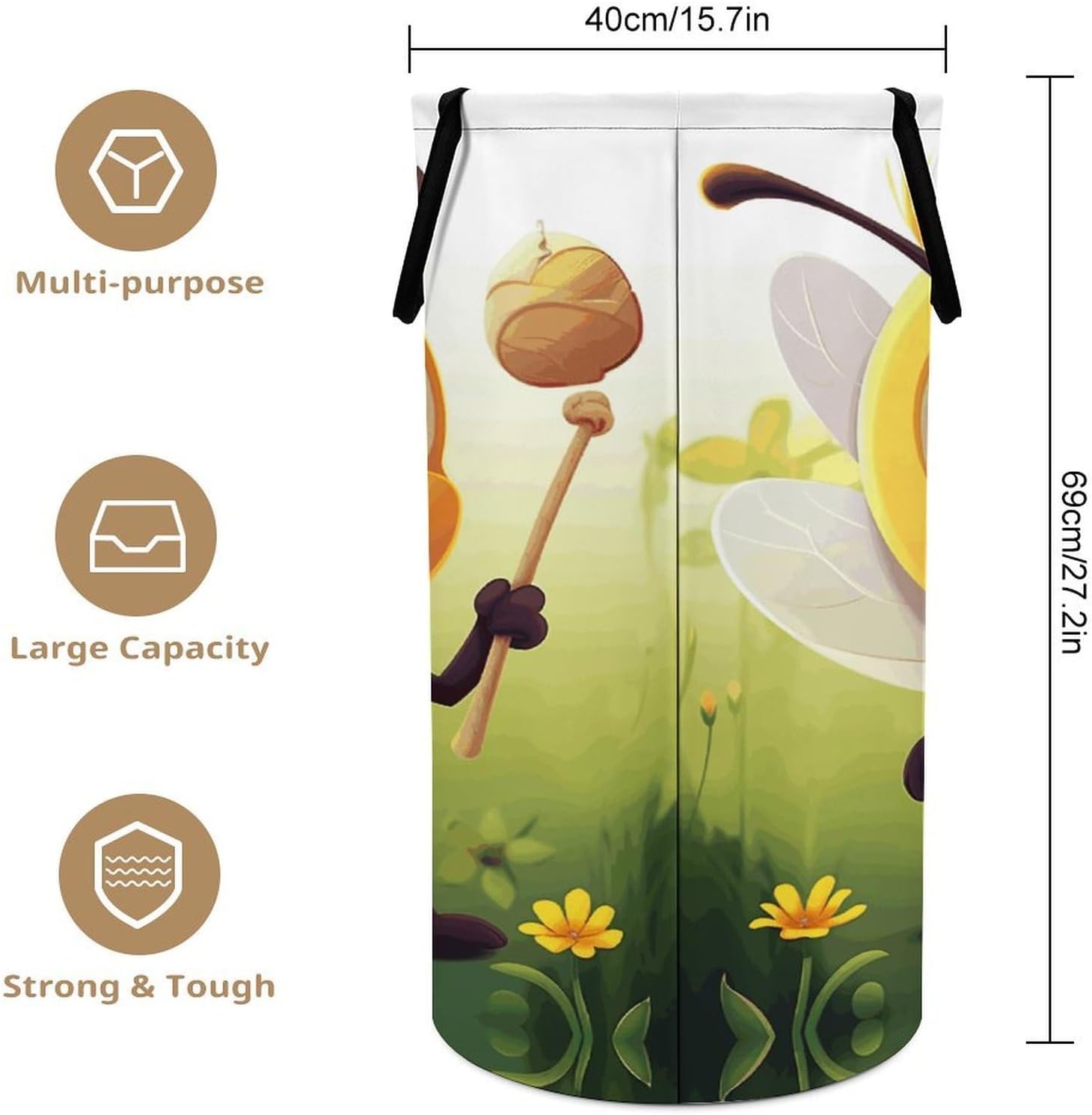The pattern of the Honey Beem hamper is printed with exquisite patterns, which makes the product more attractive.Chic design allows it to be used in the living room to hold throw blanket, pillows, and reading materials, as well as in the bathroom for towels, or as a laundry hamper.The laundry hamper adopted collapsible design, equipped with handles. It is lightweight and portable for using, storing, and moving conveniently.Honey Beem Clothes hamper is suitable to store dirty clothes washing, place in the room to store toys, and other household goods, keep the house clean and tidy. Perfect laundry hamper for home, office, closet organizer, bedroom, bathroom, college dorm, etc.Gets out of your way when you need it to. This storage basket or laundry hamper is a good gift, which not only meets everyday storage needs but also carries deep care and love, a perfect way to turn thoughtfulness into warmth.
